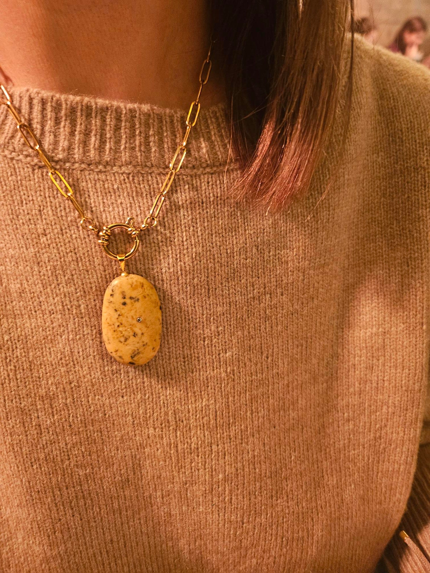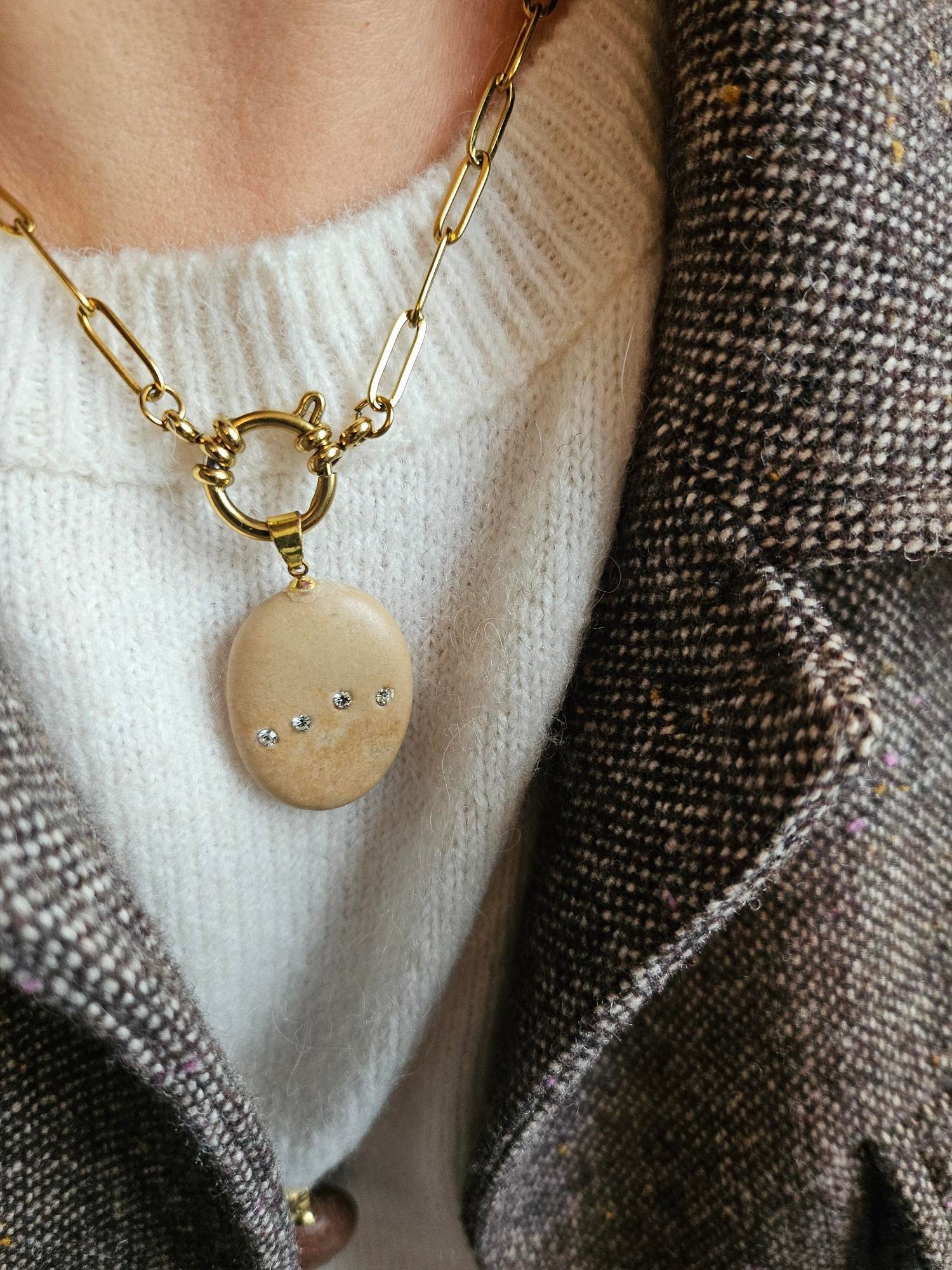 Cada uno de nuestros colgantes está creado a partir de auténticas piedras de mar, transformadas a mano en piezas exclusivas para mujeres seguras, independientes y fieles a sí mismas. Las circonitas incrustadas aportan un brillo sutil, como ese destello de confianza que no necesita exagerarse para ser notado. Son joyas sostenibles, irrepetibles y llenas de significado, pensadas para quienes no buscan seguir tendencias, sino expresar su esencia con elegancia y libertad. Llevar una de estas piezas es elegir el lujo consciente: la belleza natural del océano unida a la fuerza interior de quien sabe lo que quiere y se atreve a sentirlo.