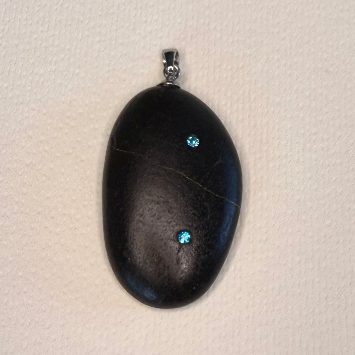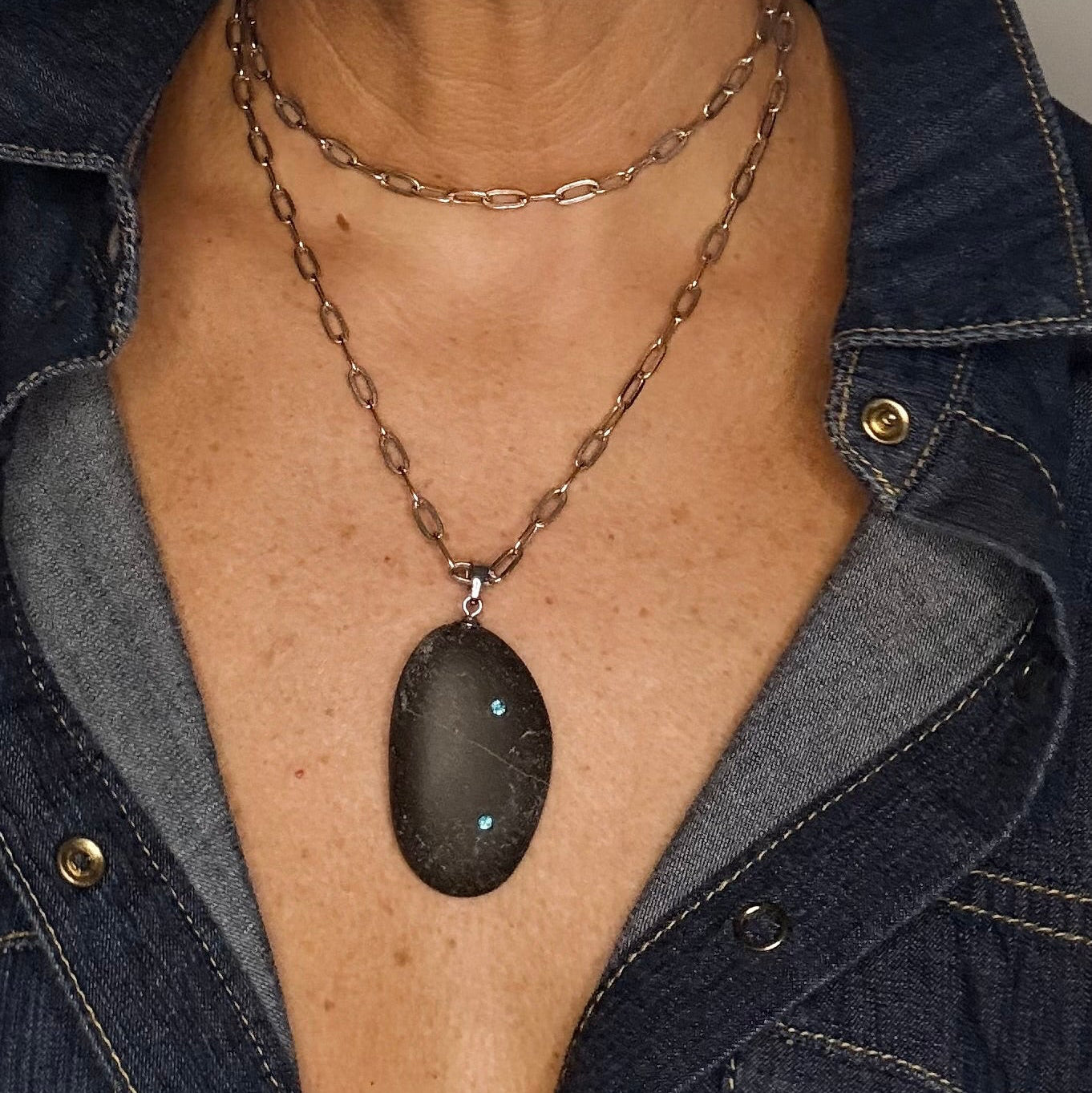 Colgante de piedra de mar ovalada en color negro, atravesada por una sutil franja blanca y realzada con dos cristales Swarovski en azul cielo. Su enganche en acero inoxidable completa una pieza distinta, sofisticada y llena de personalidad.