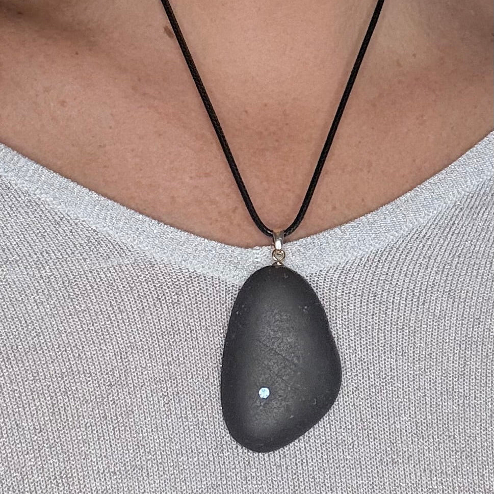 Colgante de piedra de mar de un negro profundo, realzada con un cristal Swarovski en azul que aporta un toque de luz y distinción. Su enganche en acero inoxidable dorado completa una pieza única… ¡una auténtica maravilla de la naturaleza!.Siente la energía del mar.