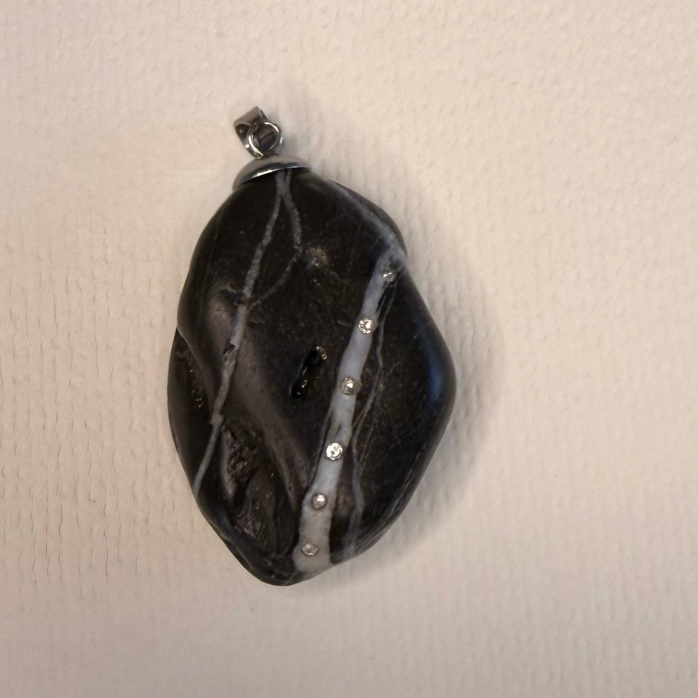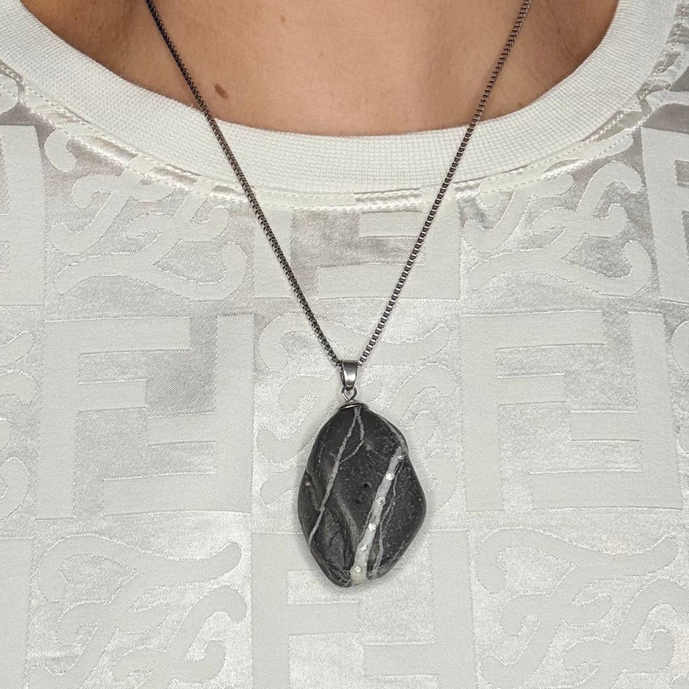 Colgante de piedra de mar con una forma irregular y con delicadas franjas blancas y perforaciones naturales que realzan su carácter único. Adornada con seis circonitas blancas de 2 mm y un enganche en acero inoxidable, es una pieza rústica, auténtica y diferente.Brillaras y sentirás la energía “Little”.