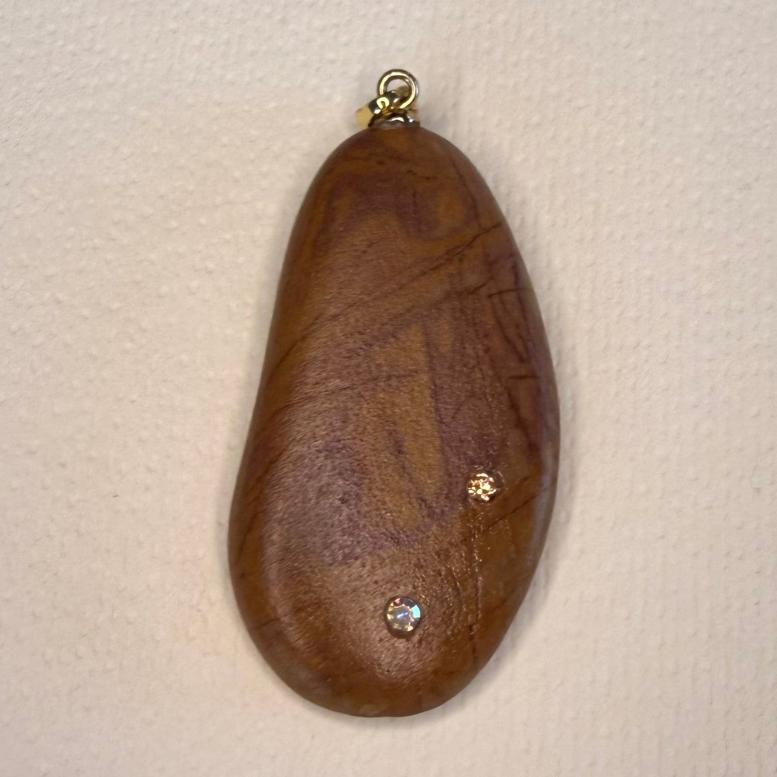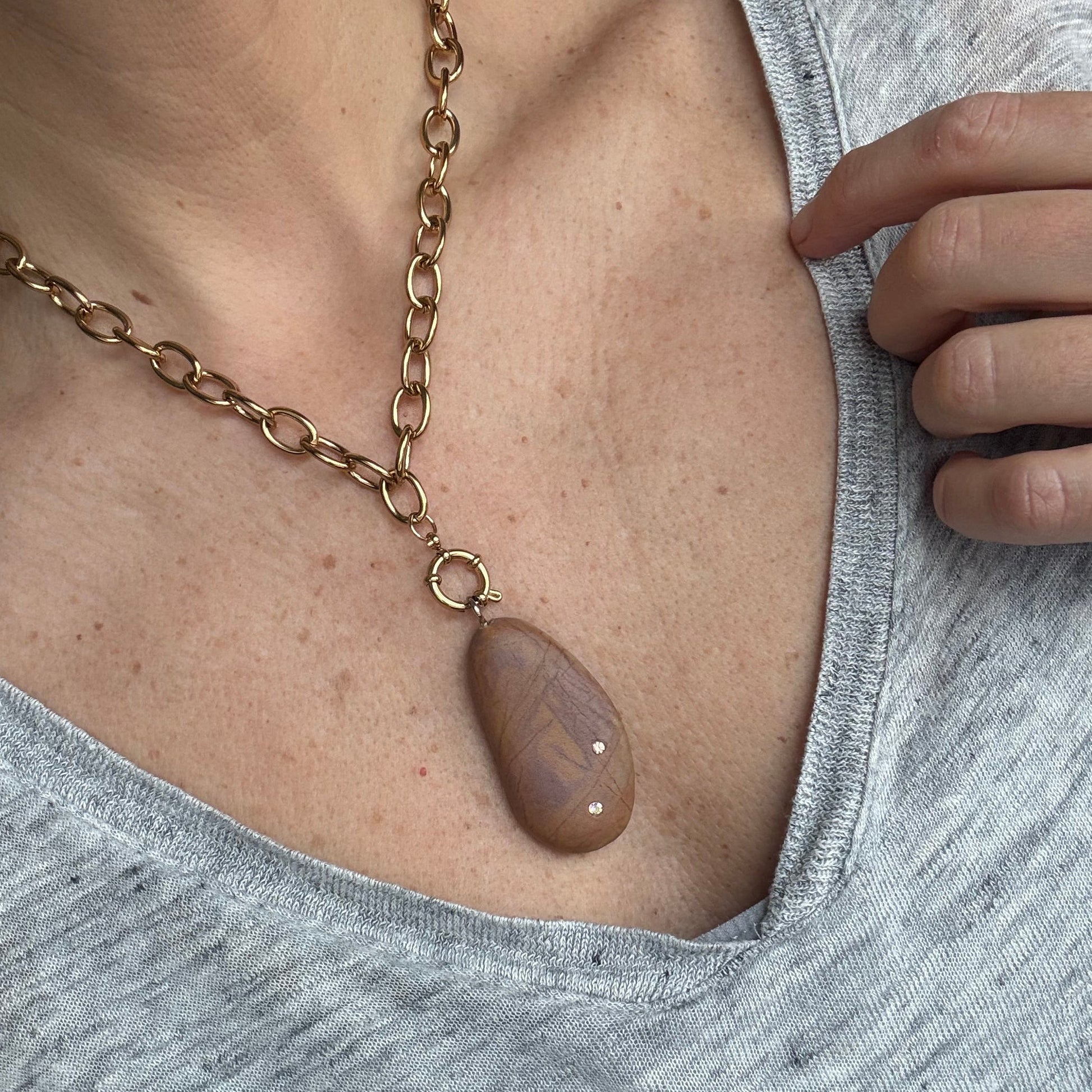 Maravilloso colgante con piedra de mar alargada en tono marrón con delicadas vetas rosadas, embellecida con dos circonitas que aportan un toque de luz. Su enganche en acero inoxidable dorado completa una pieza única.