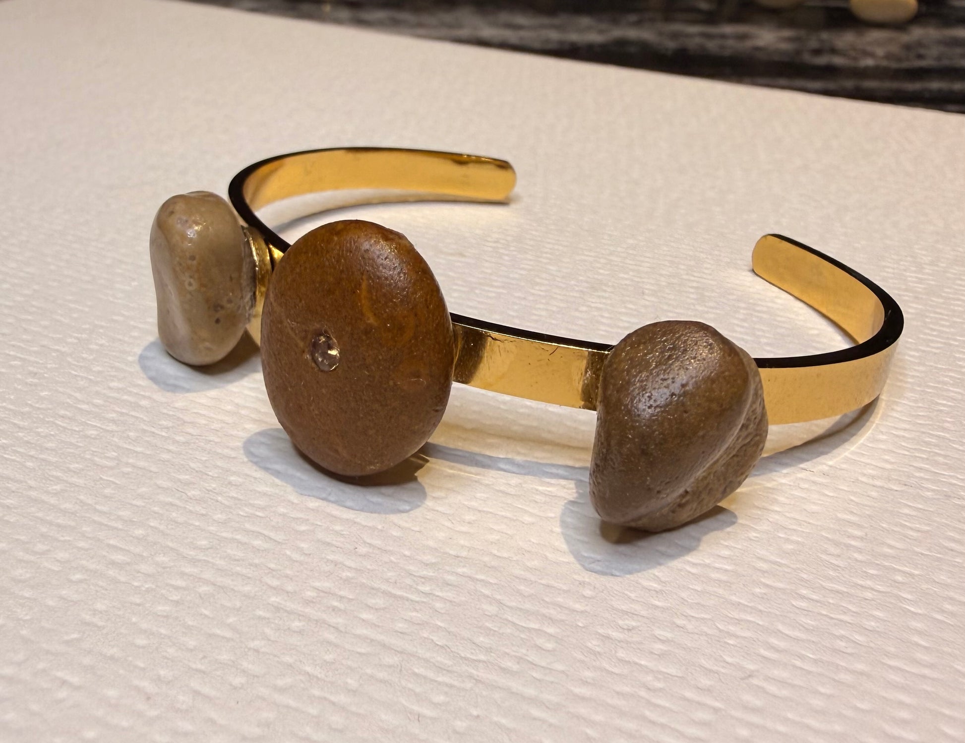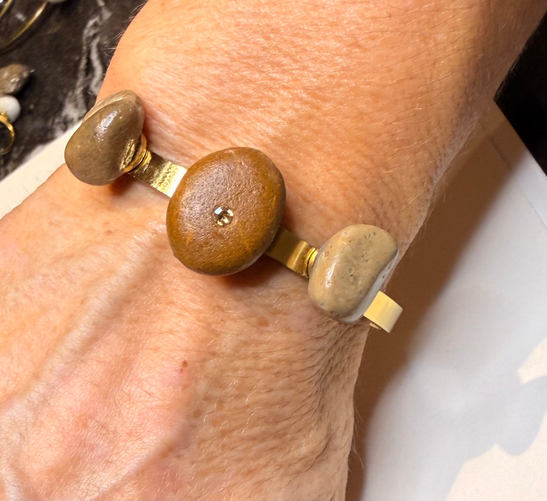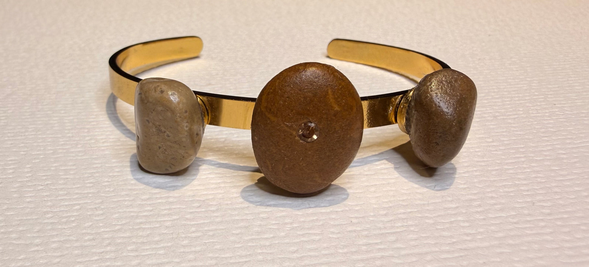Brazalete de acero inoxidable dorado con tres piedras de mar en suaves tonos marrones y beige, cada una con su forma e historia. En la central, un cristal salmón que ilumina su superficie. Base dorada de acero inoxidable, plana y ajustable. Un brazalete que guarda el ritmo de las olas.