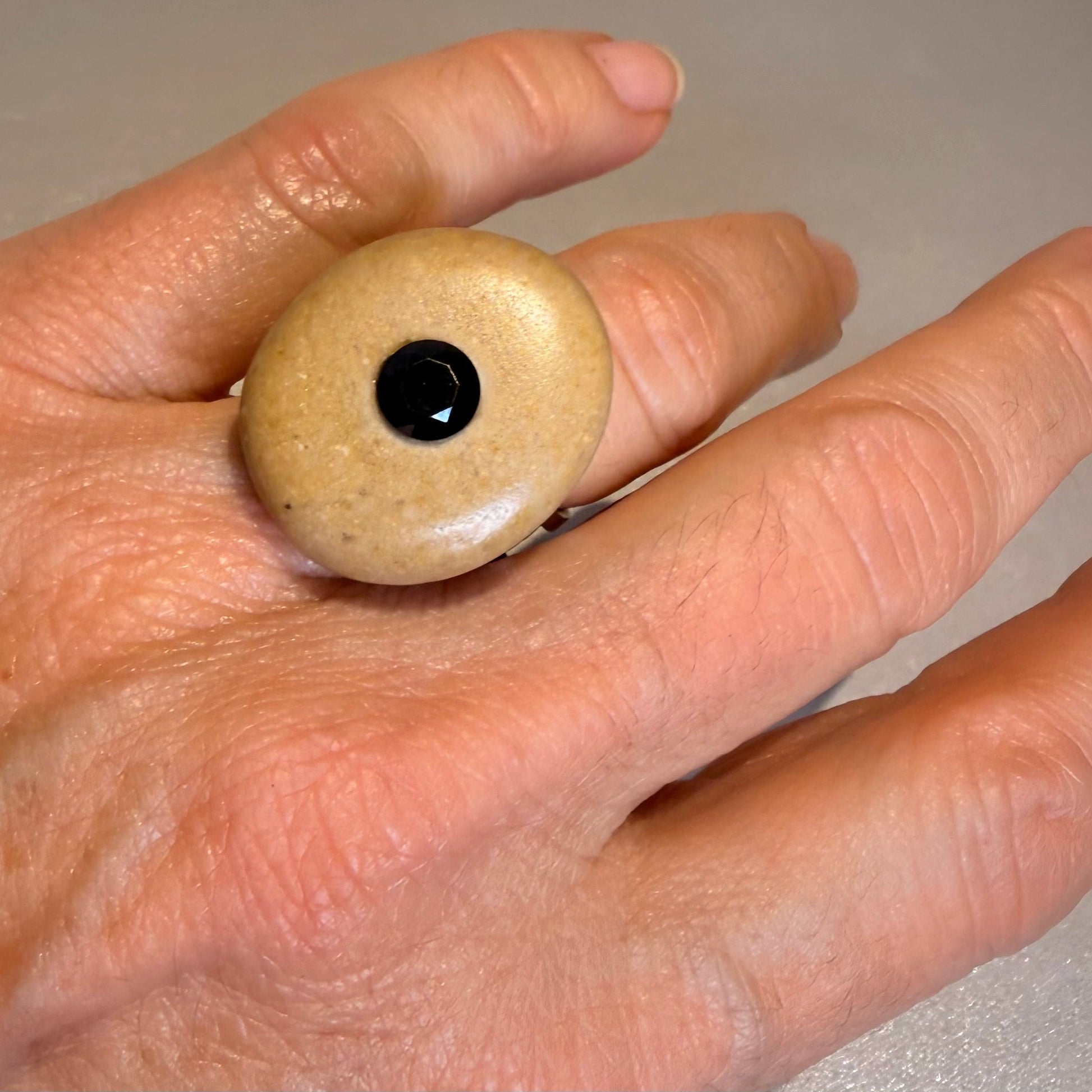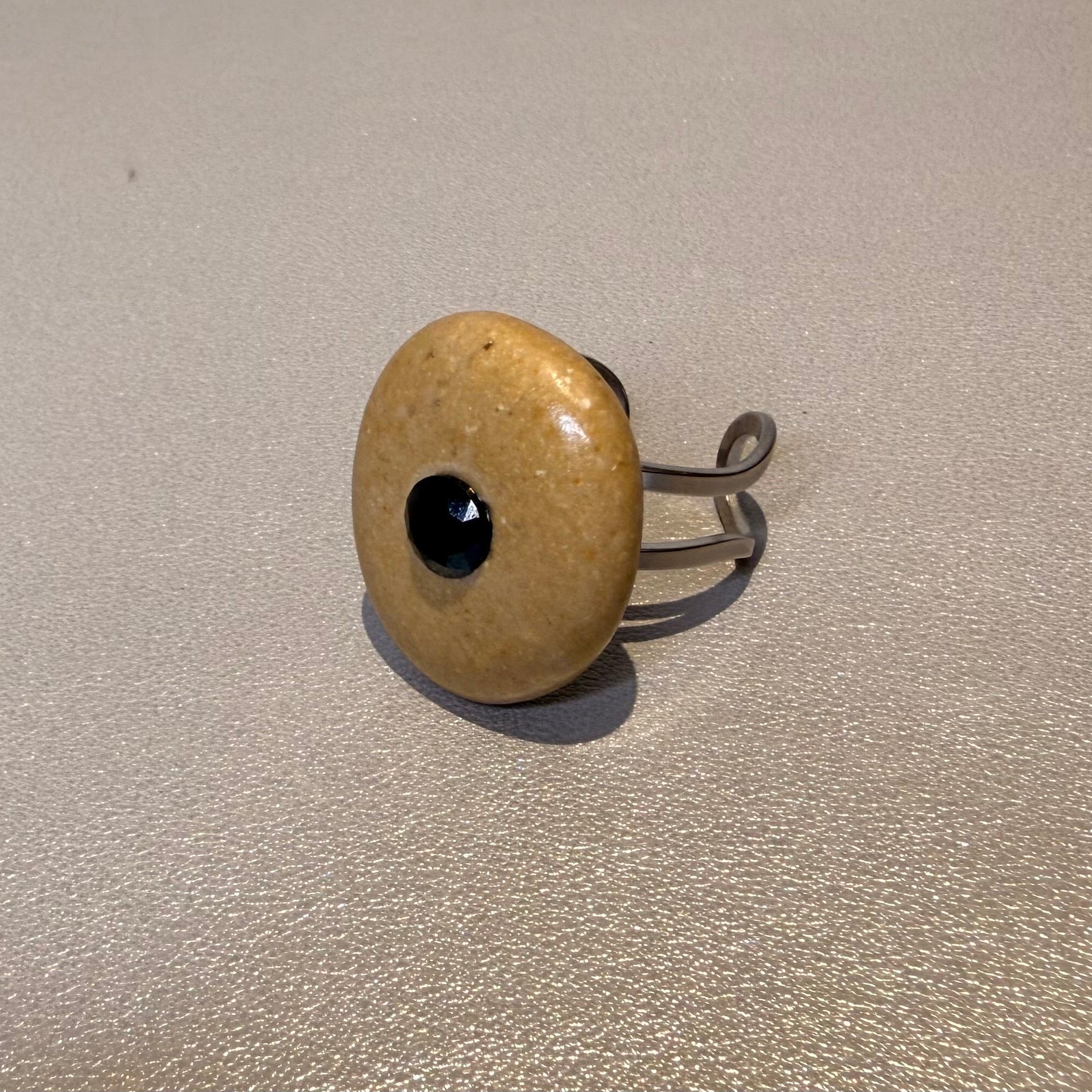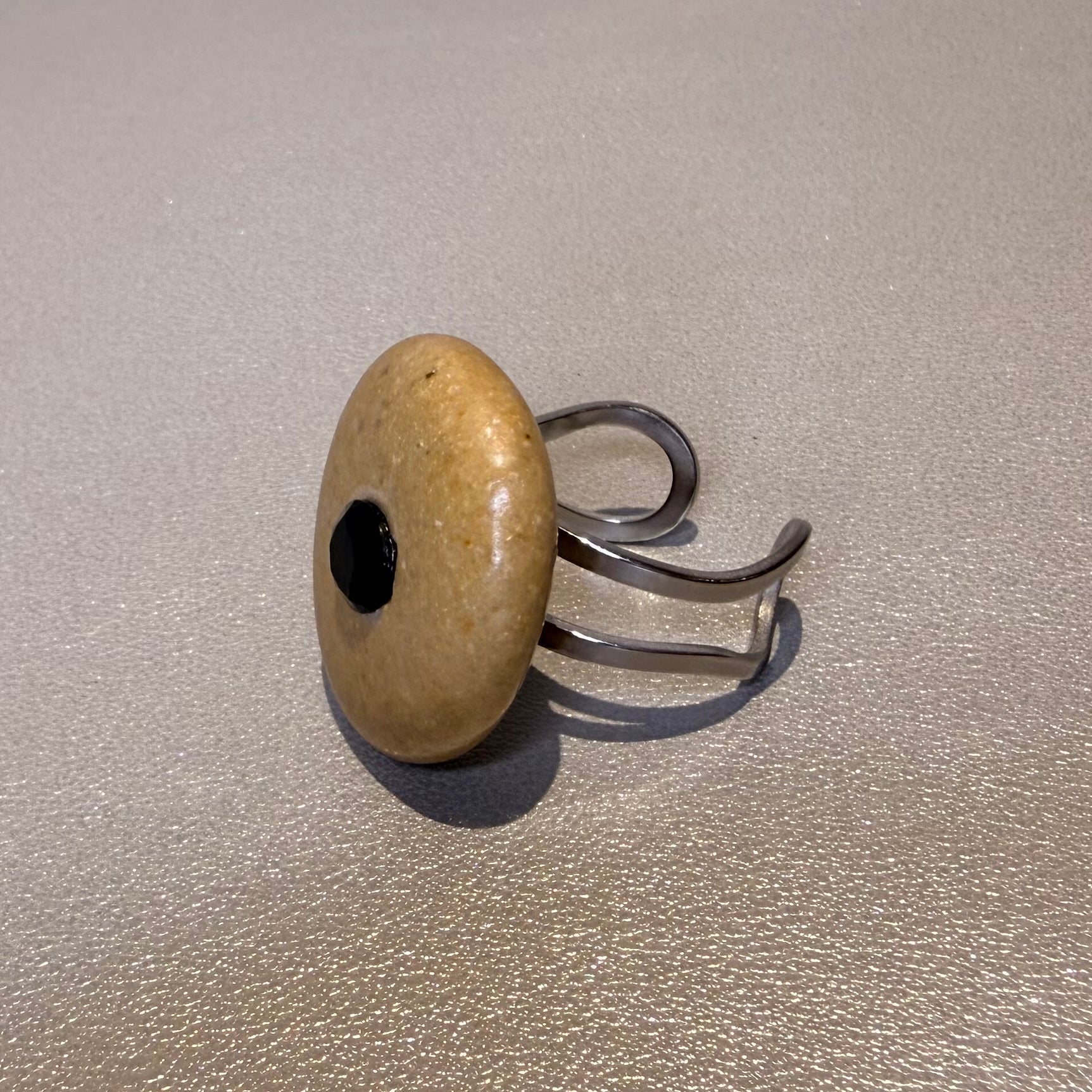Espectacular anillo con una piedra de mar suave y natural en tono beige realzada por una llamativa incrustación de cristal negro central de gran tamaño que aporta fuerza y contraste. Montado sobre una base doble de acero inoxidable ajustable, resistente y cómoda, que se adapta perfectamente a cualquier dedo.