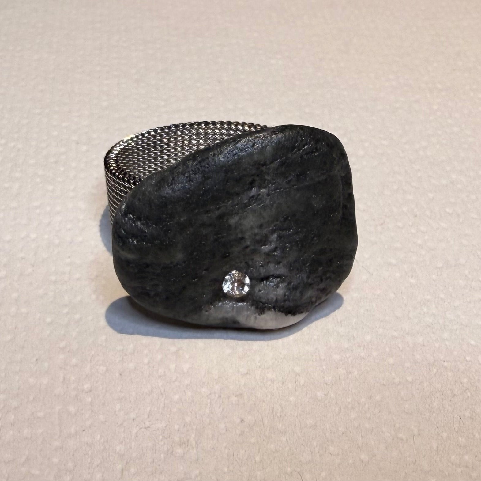 Anillo con piedra de mar en tonos gris, negro y blanco, de textura rugosa y natural.