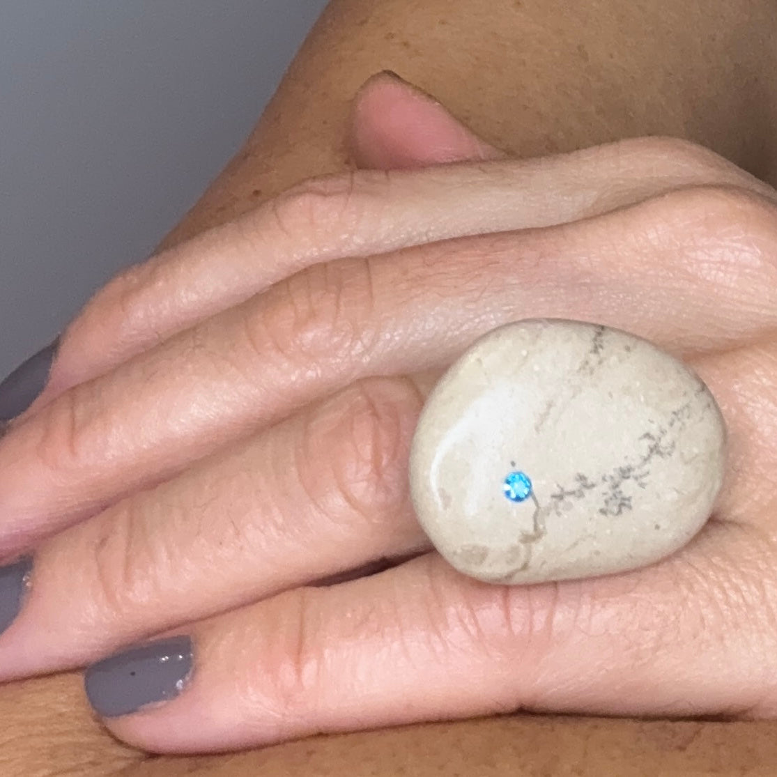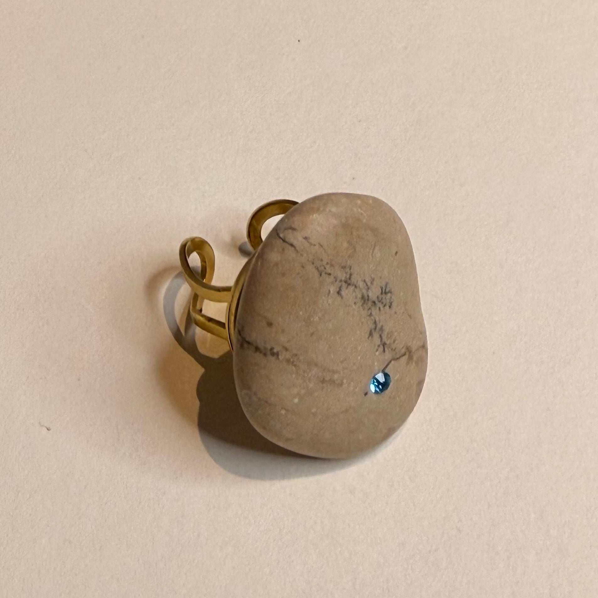 Espectacular anillo extra grande con una piedra de mar en tonos grises, atravesada por vetas negras que revelan su origen natural. Lleva una incrustación de cristal en azul mar que aporta un brillo profundo y elegante. Montado sobre una base de acero inoxidable dorado y ajustable, es una pieza exclusiva que destaca por su fuerza y belleza.”