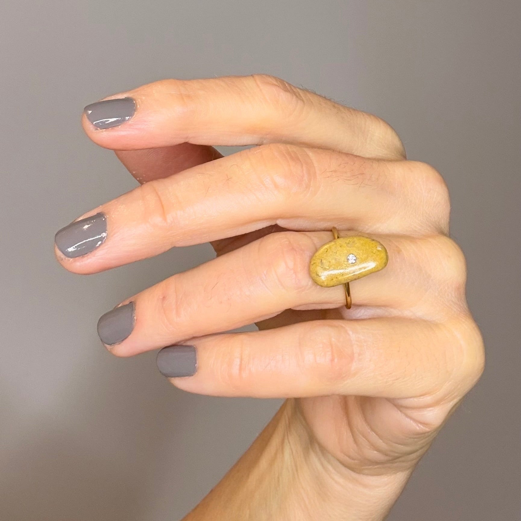 Anillo con una piedra de mar de belleza sutil, alargada por la erosión de las olas y realzada con una incrustación de circonita en el centro. Montado sobre base de acero inoxidable dorado ajustable.
