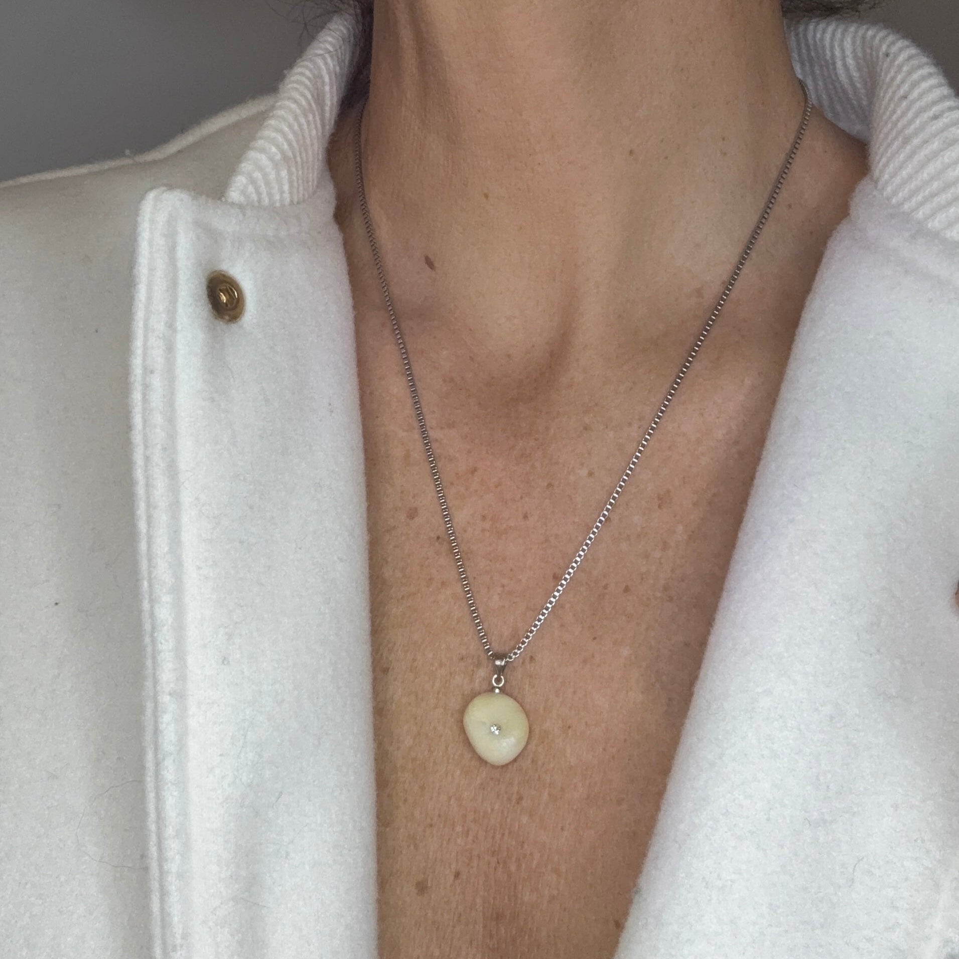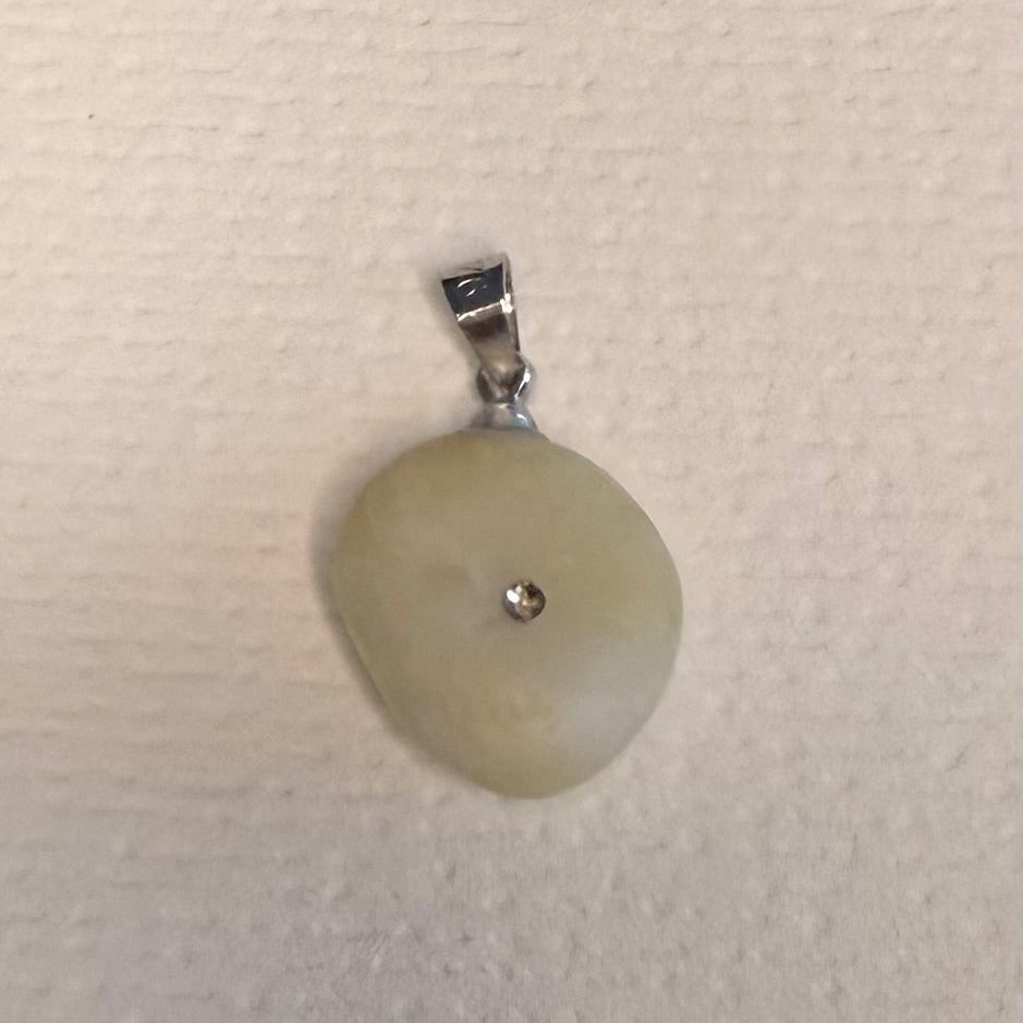 Colgante de piedra blanca, una auténtica joya que el mar pule con paciencia. Esta pequeña maravilla, con una circonita incrustada y enganche de plata, es una verdadera delicia nacida del mar.