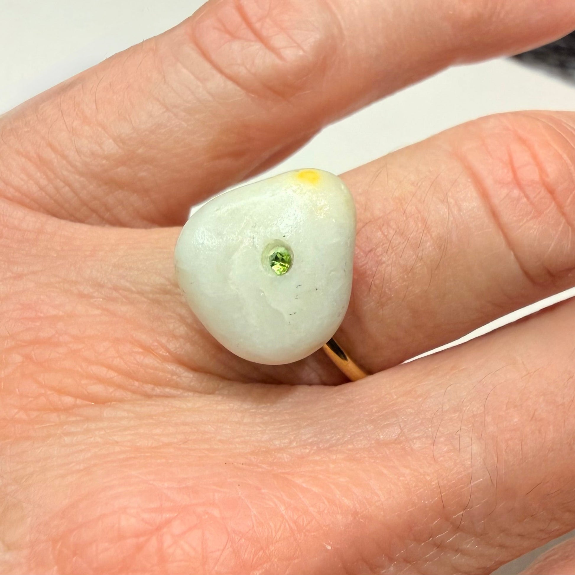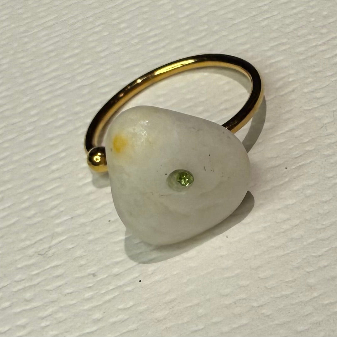 Precioso anillo en blanco, formado por capricho de la naturaleza y con una suave mancha amarilla en uno de sus bordes. Realzado con una incrustación de cristal verde y montado sobre base dorada de acero inoxidable ajustable. Una pieza única, creada para brillar con naturalidad.