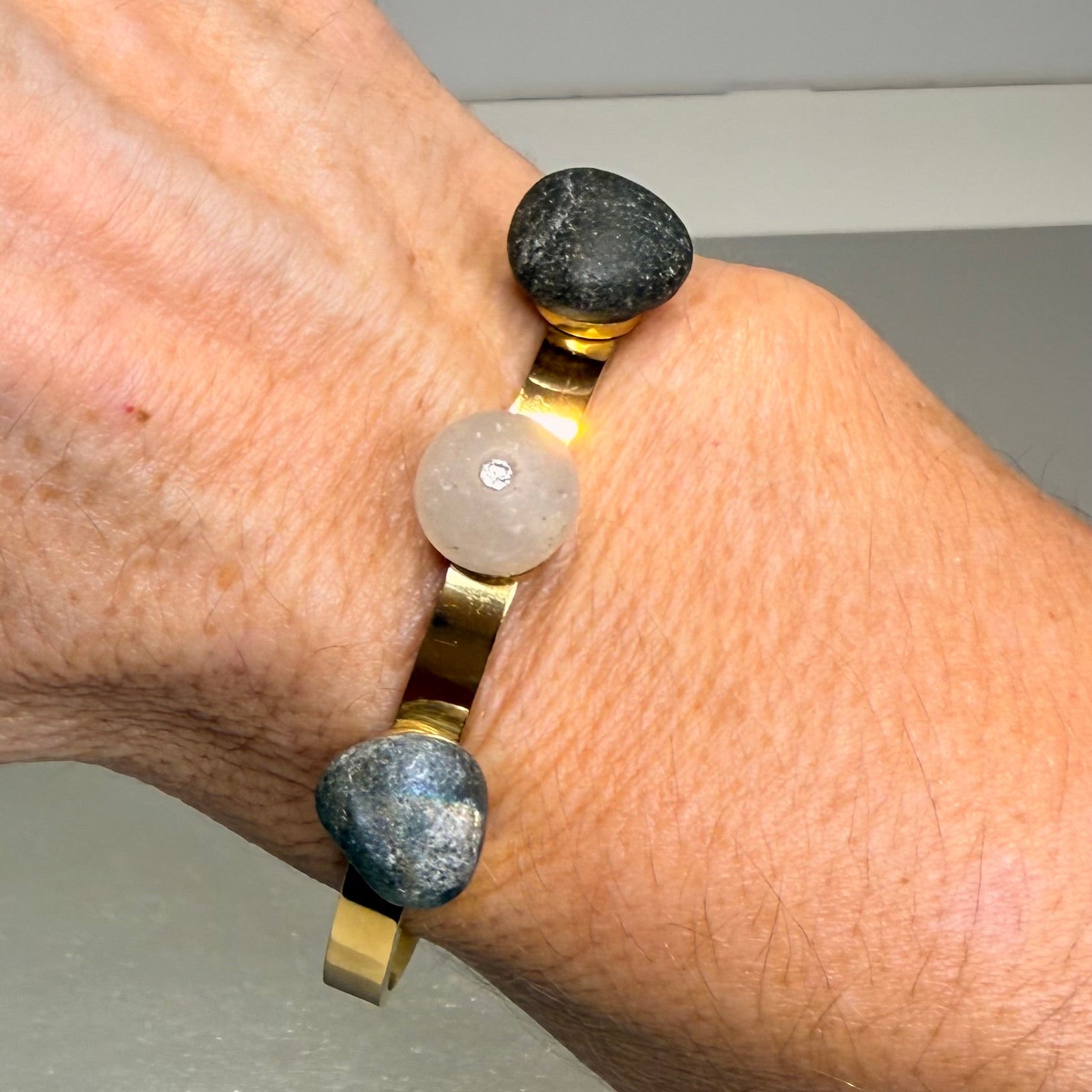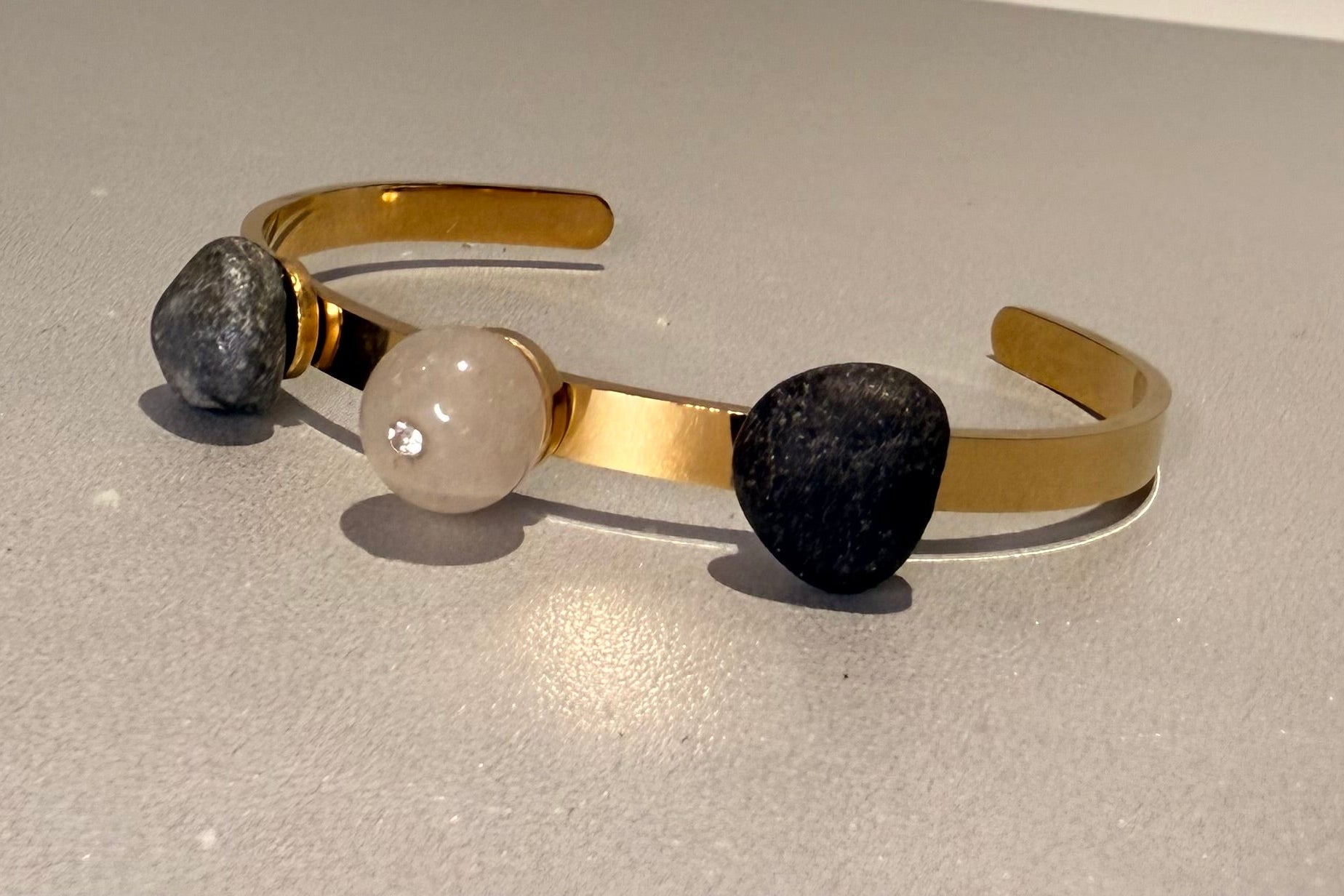 “Brazalete rígido de acero inoxidable baño dorado ,ajustable y único: dos piedras de mar en tonos negros y grises con manchas blancas abrazan un cuarzo rosa natural con incrustación de circonita. Una joya que llevarás en la muñeca sintiendo la fuerza, la calma y la energía del mar.”