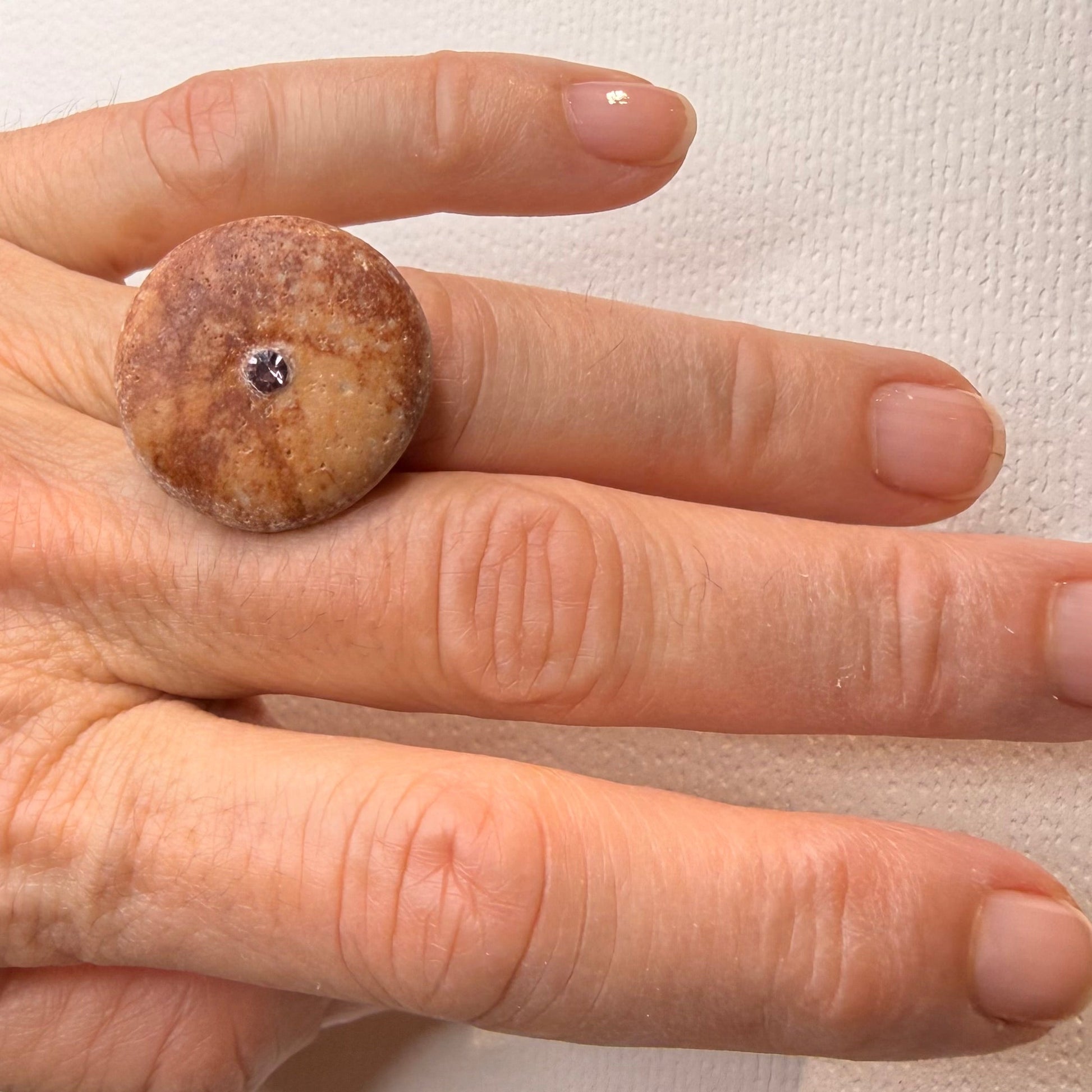 Maravillosa piedra de mar en forma de medalla, con suaves tonos rosados que evocan la calma del amanecer sobre el océano.