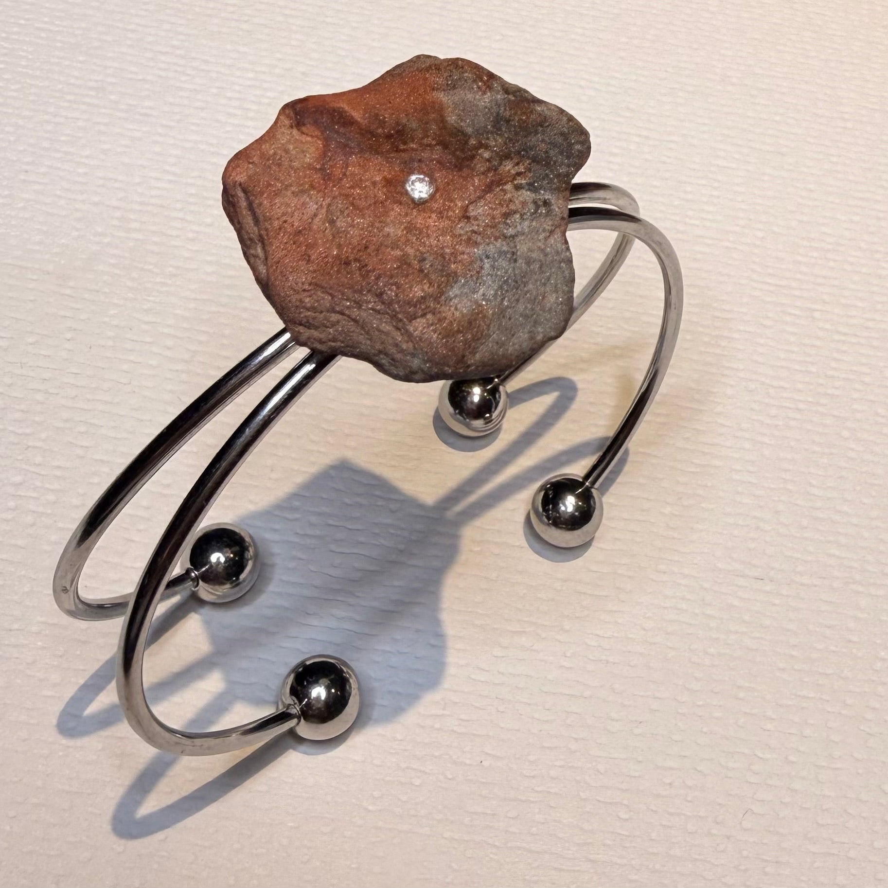 Brazalete con una preciosa y única piedra de textura rugosa, con aristas suavemente pulidas y tonos que combinan grises y rojizos. Realzada con una circonita central y montada sobre una base doble de acero inoxidable ajustable. Una pieza diferente, llena de carácter y esencia natural.