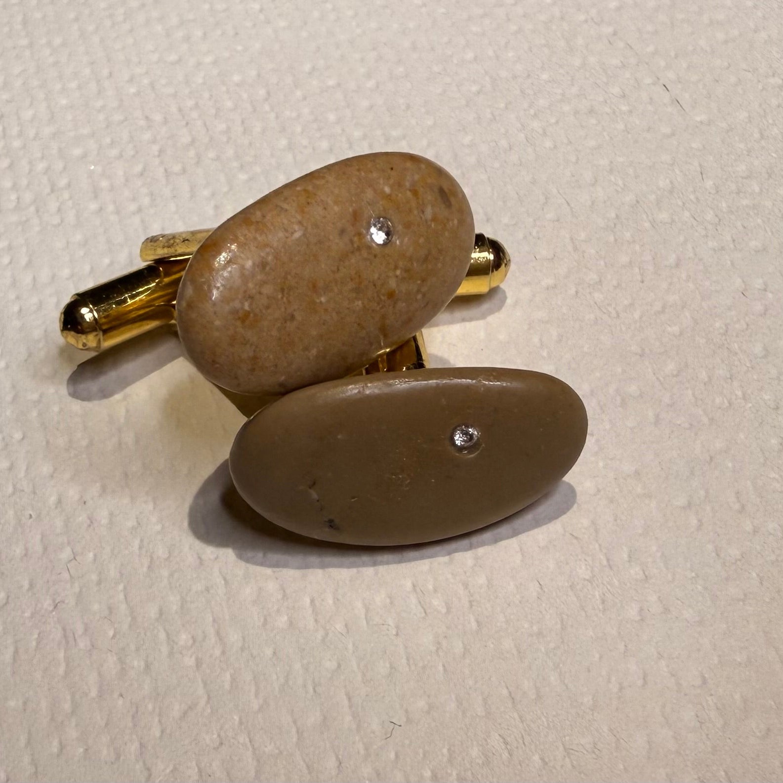 Maravillosos y exclusivos gemelos elaborados con piedra de mar en tonos marrones. Porque la perfección no siempre está en lo idéntico. Montados sobre base dorada de acero inoxidable.