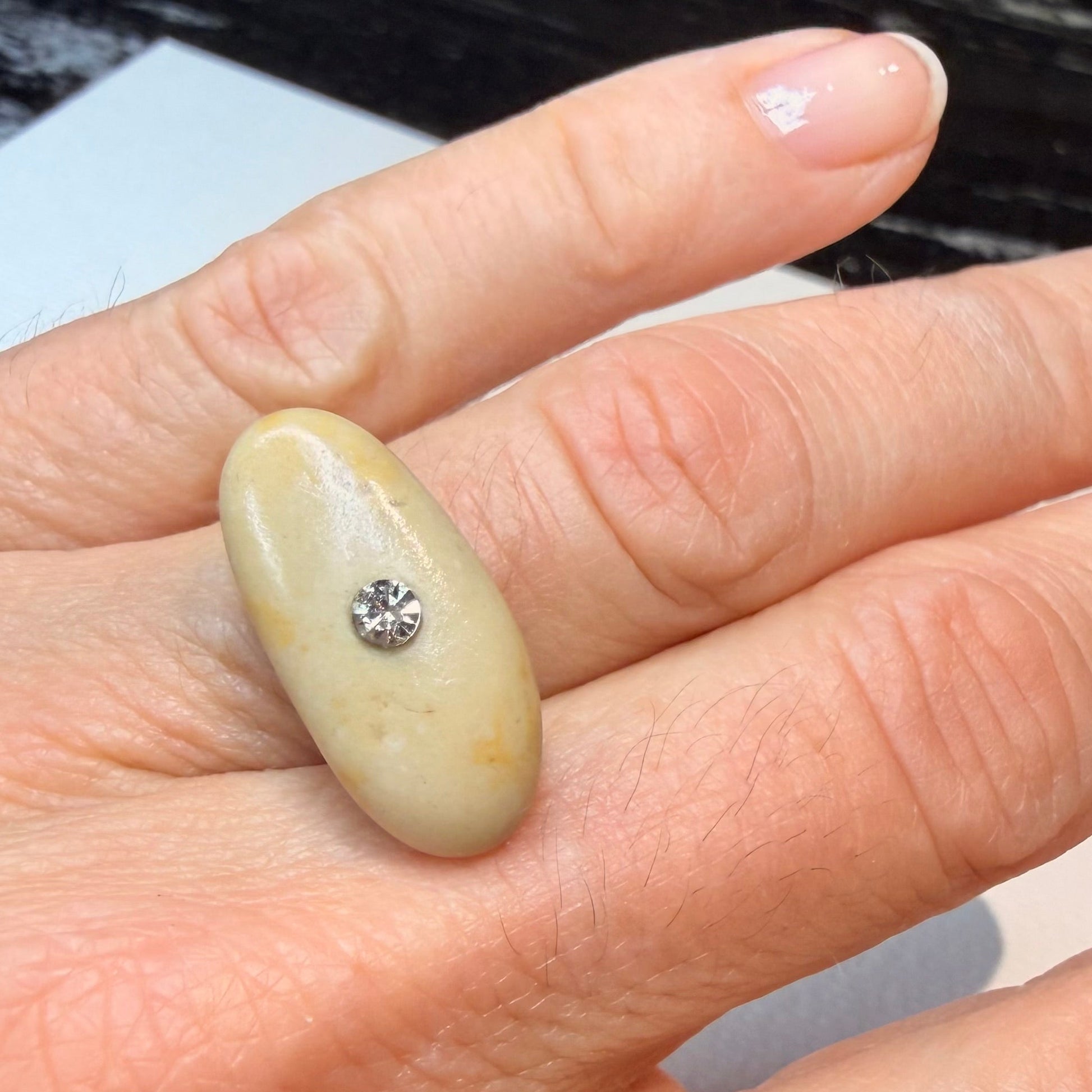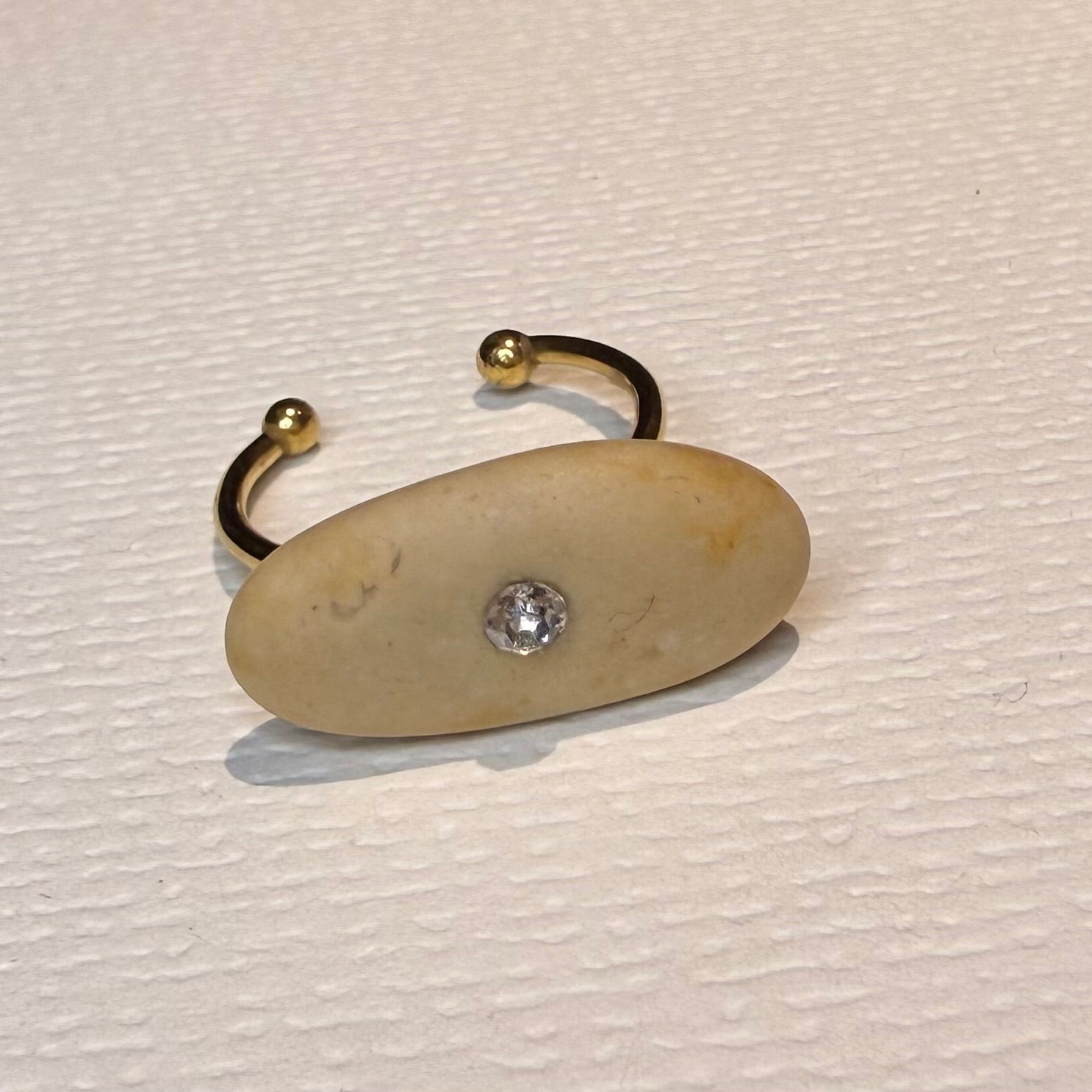 Un precioso anillo con piedra de mar en tono beige salpicado de motas bronceadas, como la arena iluminada por el sol al atardecer.