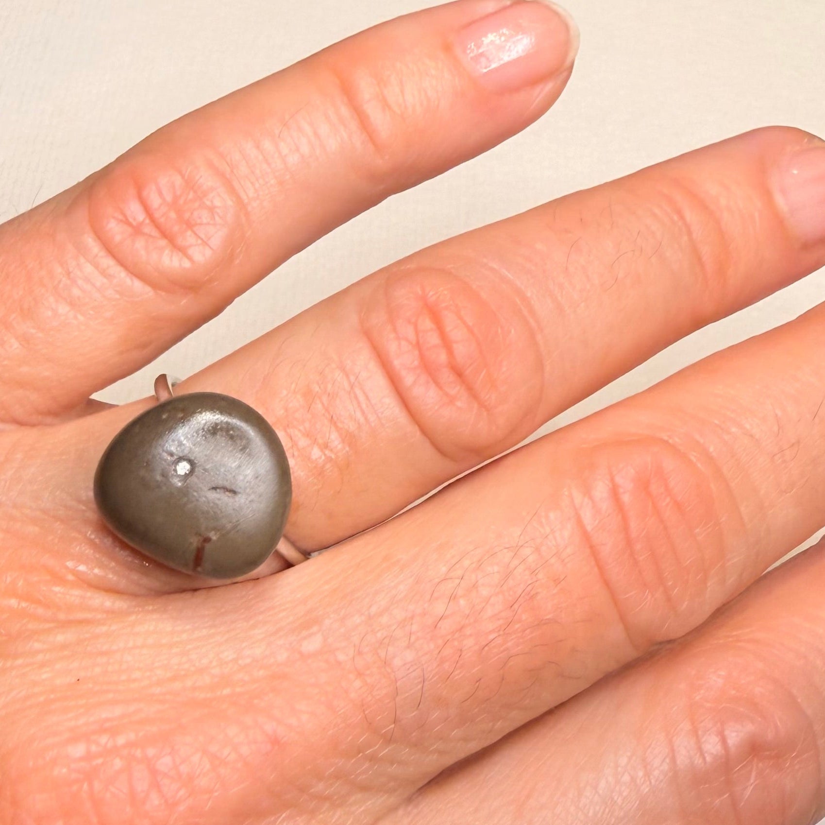Espectacular piedra en tono marrón, marcada a capricho por la naturaleza y realzada con una circonita centrada. Montada sobre base de acero inoxidable ajustable. Una pieza única e irrepetible.