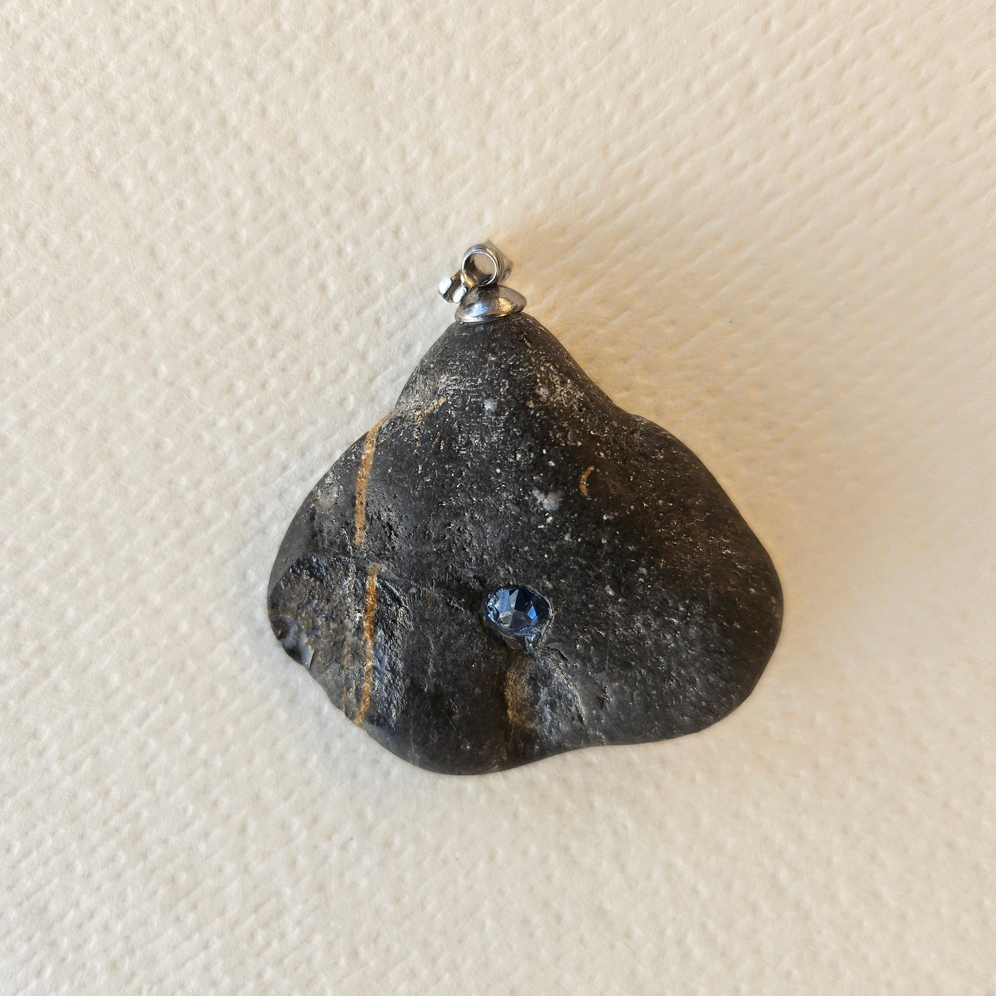 Colgante artesanal con una piedra de mar original en forma de clavel, que exhibe tonalidades negras con matices grises y toques de óxido, y una textura rugosa que aporta carácter y autenticidad. Destaca la delicada incrustación al ras con montura gitana de un cristal Swarovski azul de 2 mm, que contrasta y realza la profundidad de los tonos oscuros.