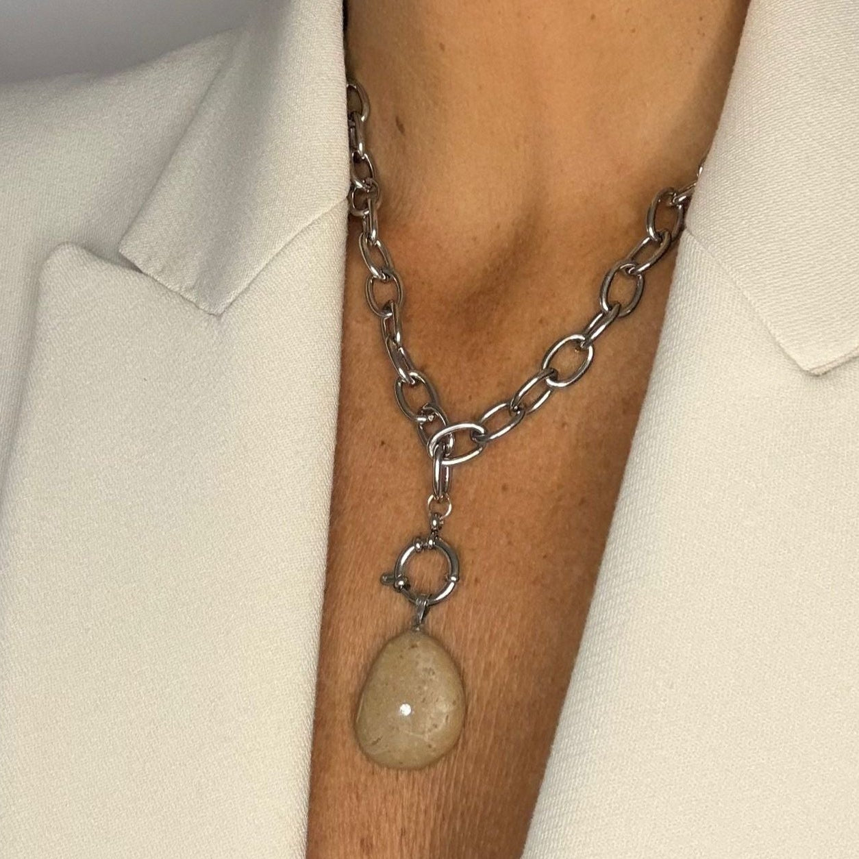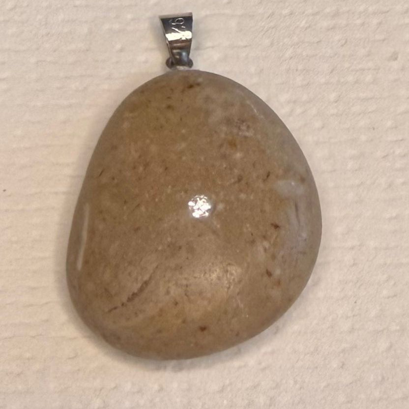 Colgante artesanal con una preciosa piedra color arena en forma de pera imperfecta, que resalta por su belleza natural y singularidad. En el centro, una circonita de 2 mm incrustada al ras realza delicadamente su forma única, aportando un sutil brillo.