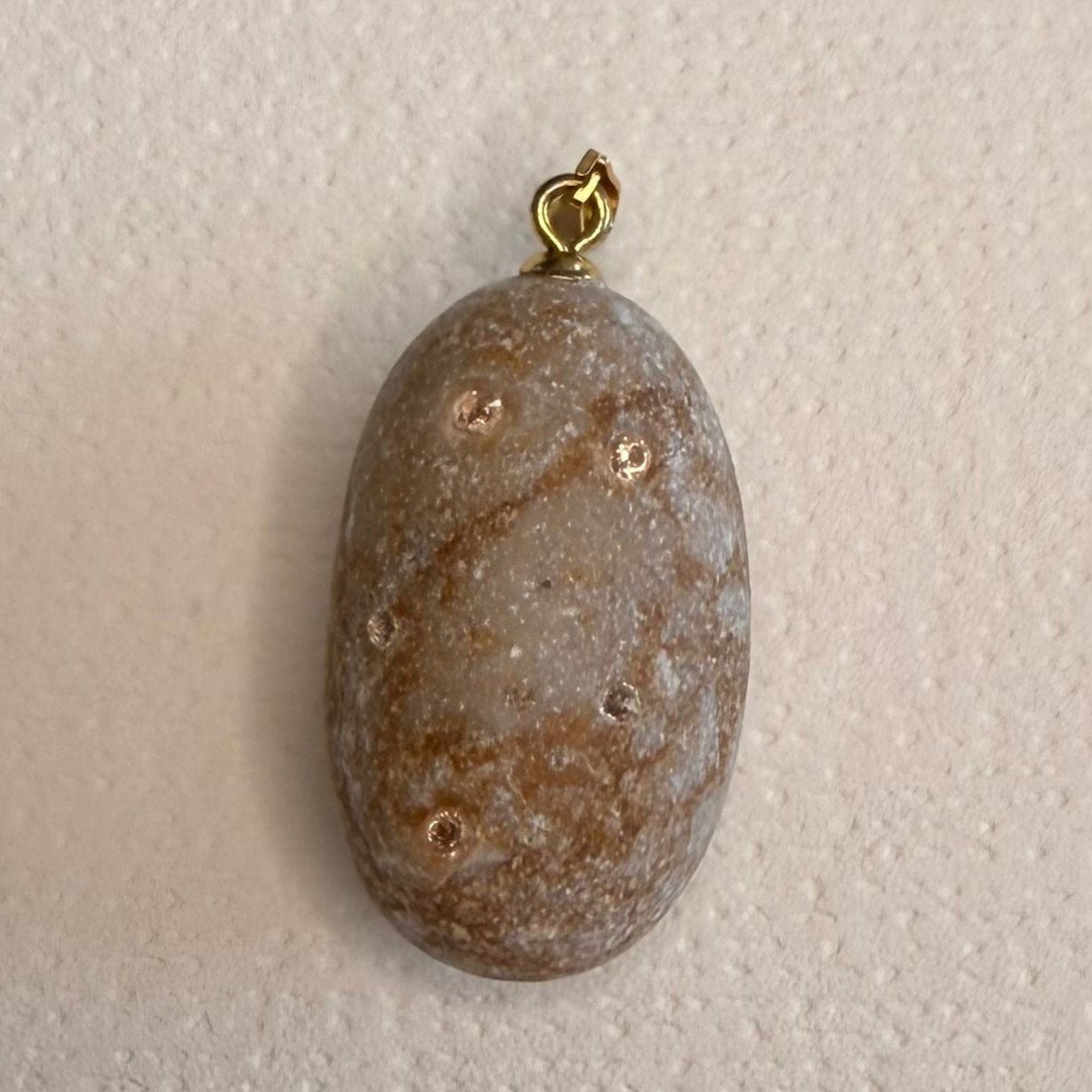 Colgante artesanal con una maravillosa piedra ovalada en color granito rosa, adornada con vetas granates que evocan ramas y raíces, haciendo cada pieza absolutamente única. Está realzado con la delicada incrustación al ras de cinco cristales Swarovski rosas, que aportan un brillo sutil y elegante.