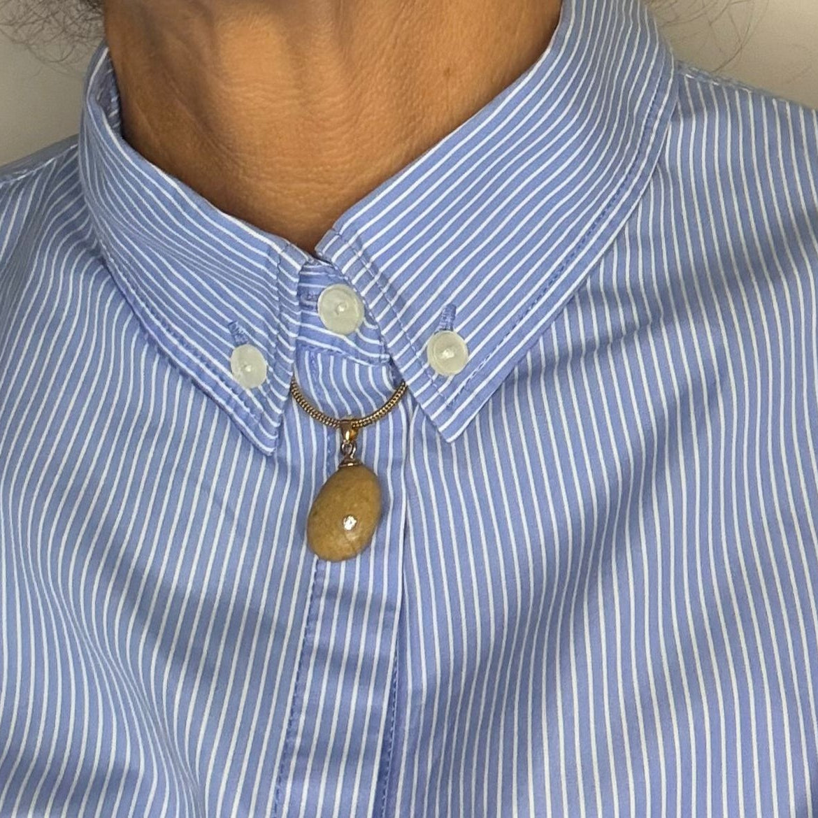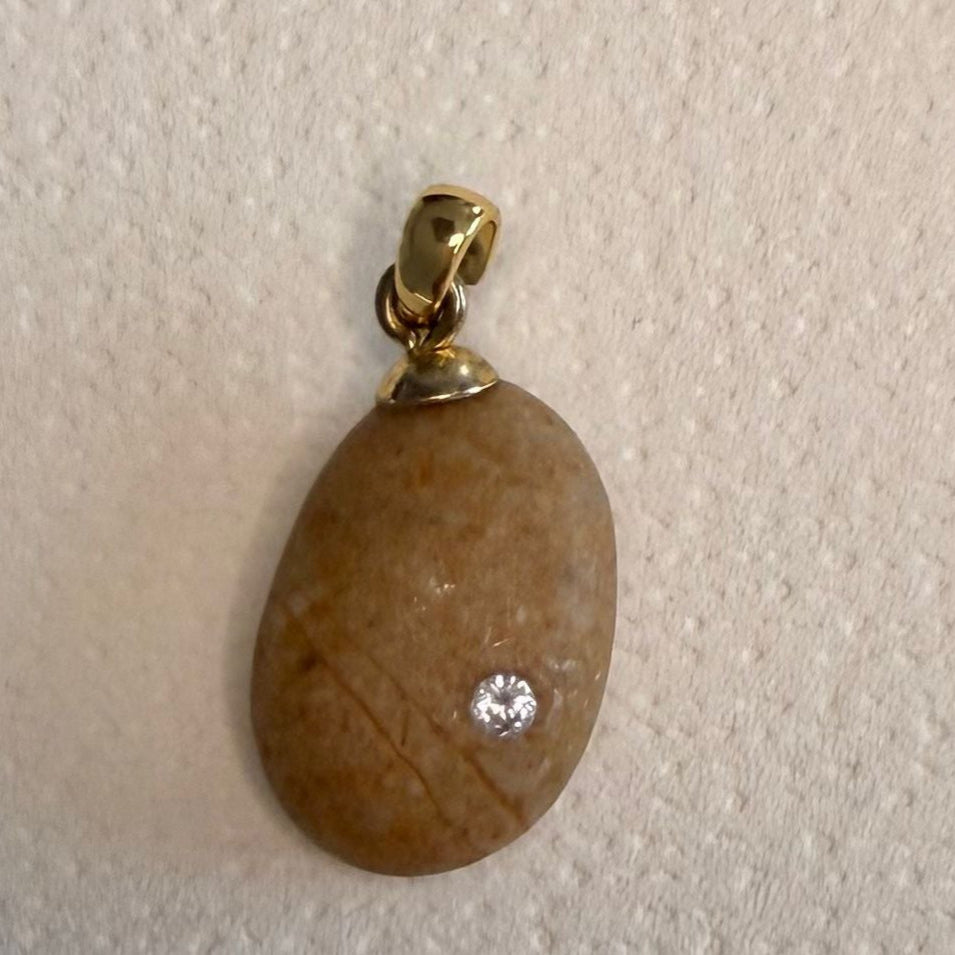 Colgante artesanal con una maravillosa piedra ovalada en tonalidades beige uniforme, realzada por dos líneas perfectas que subrayan delicadamente la incrustación al ras de una circonita de 2 mm.