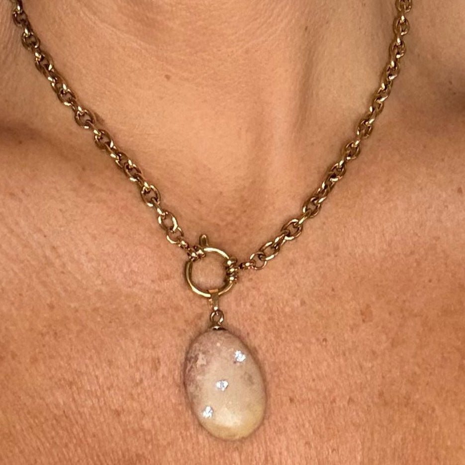 Montado sobre un enganche de acero dorado, esta pieza refleja la esencia de la artesanía y la belleza natural en una joya única y sofisticada.