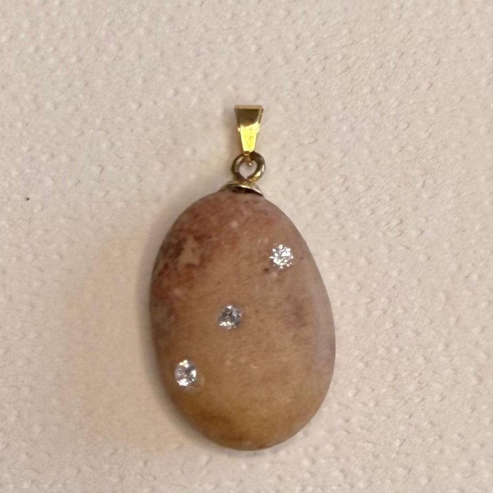Colgante artesanal elaborado con una piedra natural ovalada, sin procesos ni tratamientos, que exhibe una hermosa degradación de tonalidades color arena hasta un delicado rosa, característica que le confiere una originalidad extrema. Tres circonitas de 2 mm, incrustadas al ras, realzan magistralmente la singularidad cromática de la piedra.