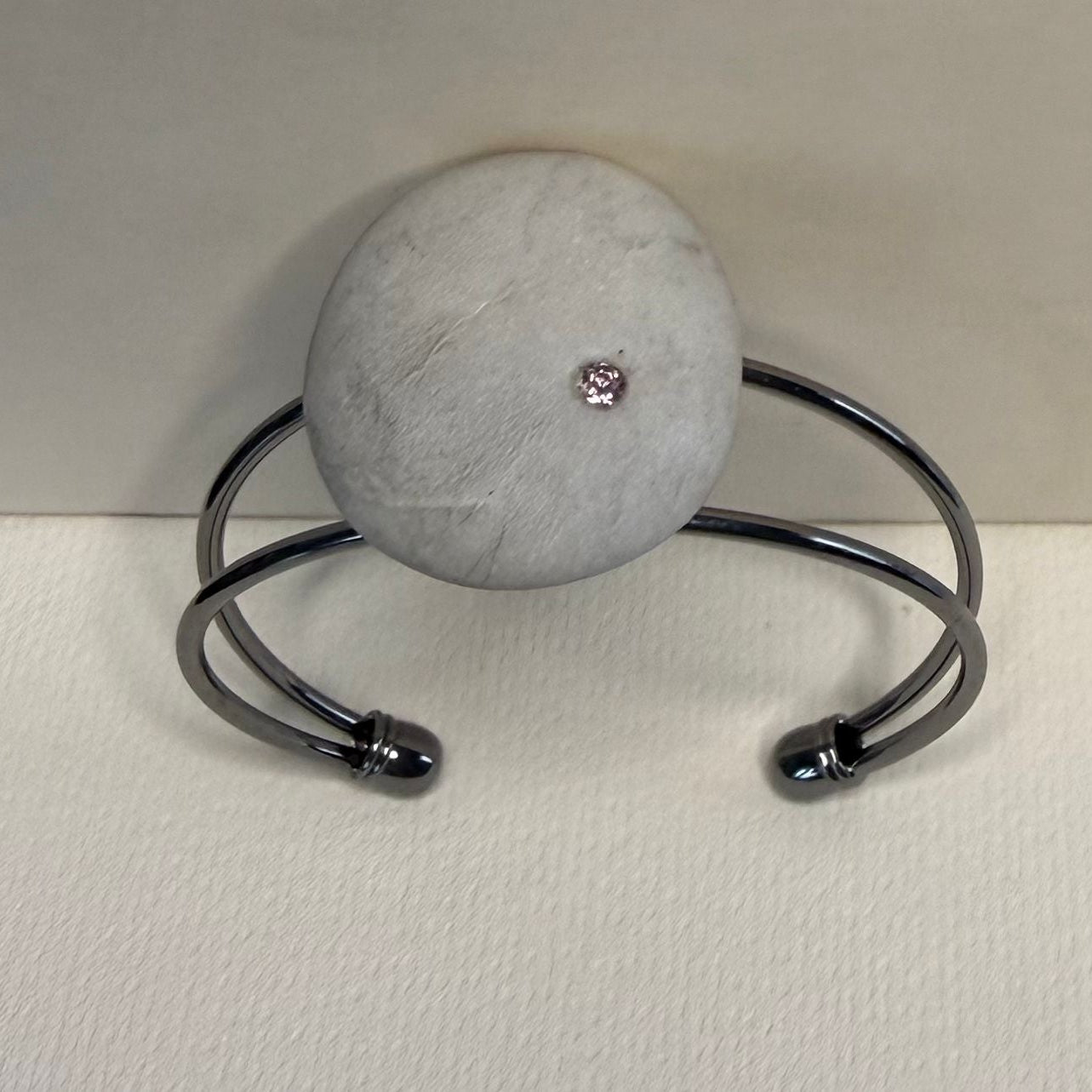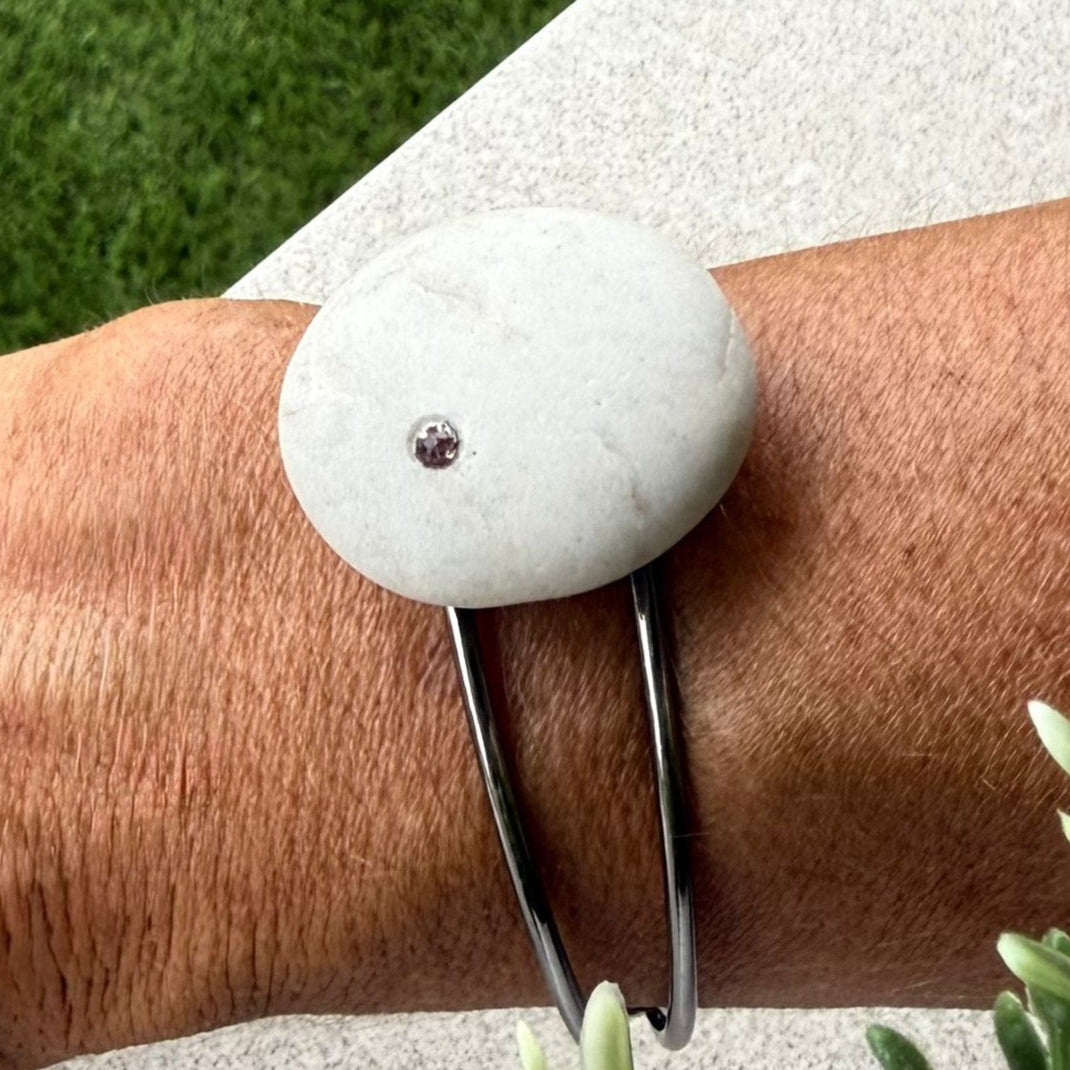 Brazalete rígido de acero inoxidable plateado con acabado pulido, diseñado para destacar la pureza de los materiales. La pieza central está compuesta por una piedra de mar natural en tonalidad blanca, sin tratamientos ni procesos artificiales, conservando su textura orgánica y esencia costera. Como detalle delicado, una cristal swaroski rosa de 2 mm engarzado al ras (montura gitana) aporta un brillo sutil que complementa la sobriedad del diseño.