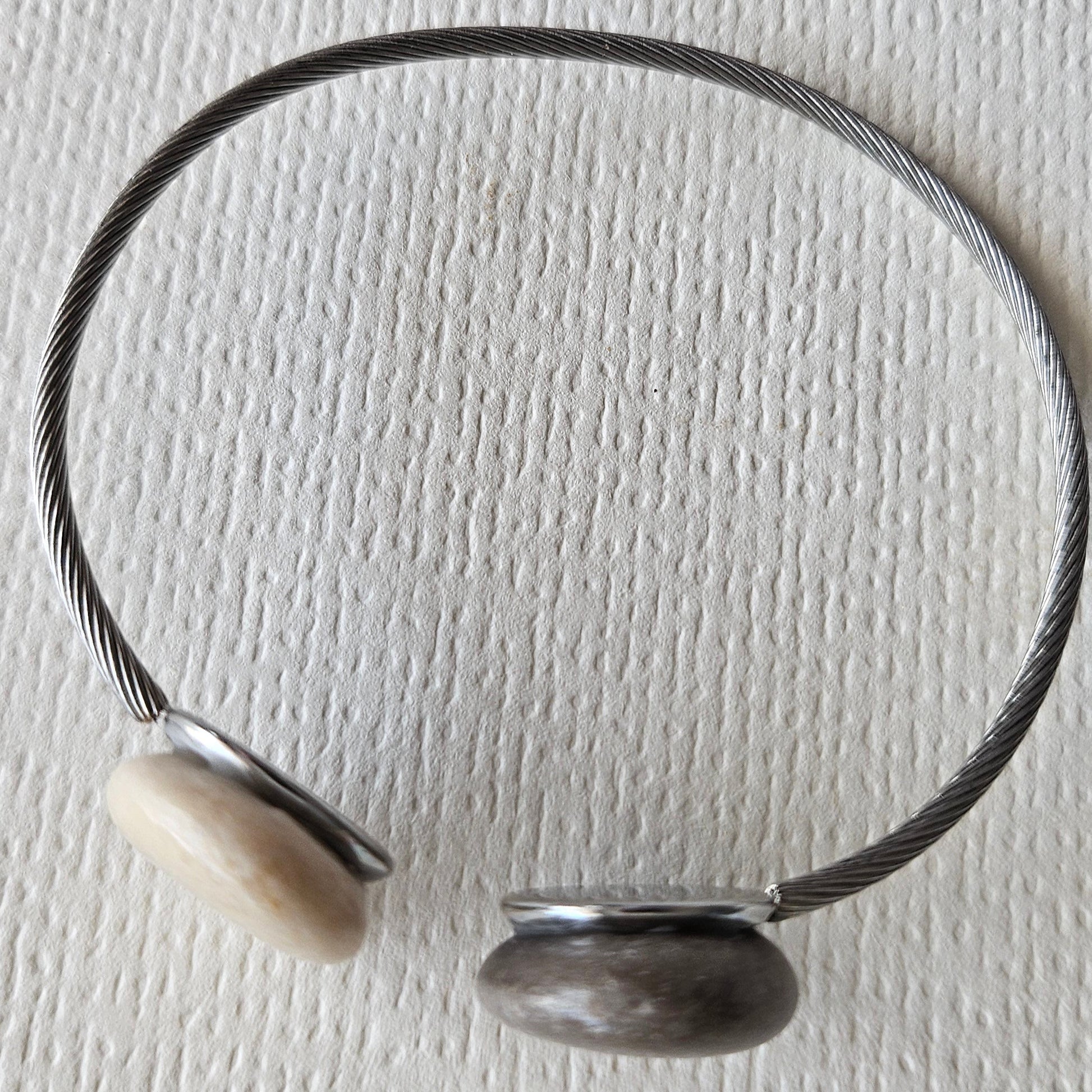 Brazalete abierto en acero plateado, de líneas limpias y diseño orgánico, elaborado artesanalmente con piedras de mar de formas suavemente ovaladas. La pieza combina una piedra blanca y otra negra, esta última realzada con una circonita incrustada con la técnica al ras, que aporta un brillo sutil sin alterar la textura natural. Cada brazalete se realiza a mano, sin químicos, respetando la esencia de los materiales y el entorno. Un diseño exclusivo y consciente, pensado para mujeres que valoran la autenticidad, la sostenibilidad y la elegancia natural.