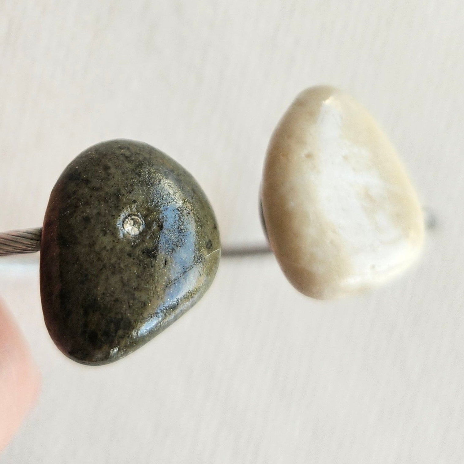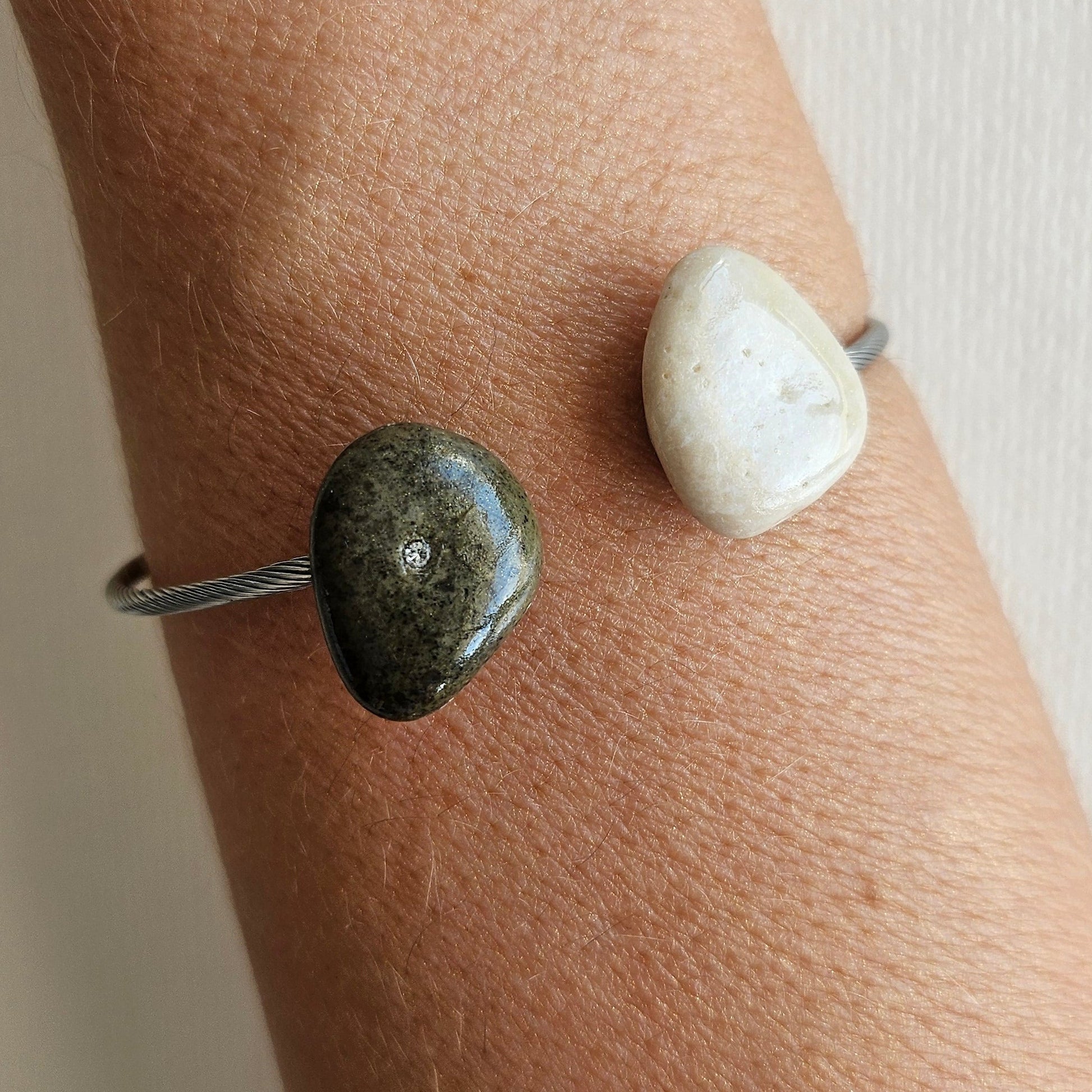 Brazalete abierto en acero plateado, de líneas limpias y diseño orgánico, elaborado artesanalmente con piedras de mar de formas suavemente irregulares. La pieza combina una piedra blanca y otra negra, esta última realzada con una circonita incrustada con la técnica al ras, que aporta un brillo sutil sin alterar la textura natural. Cada brazalete se realiza a mano, sin químicos, respetando la esencia de los materiales y el entorno. Un diseño exclusivo y consciente, pensado para mujeres que valoran la autenticidad, la sostenibilidad y la elegancia natural.