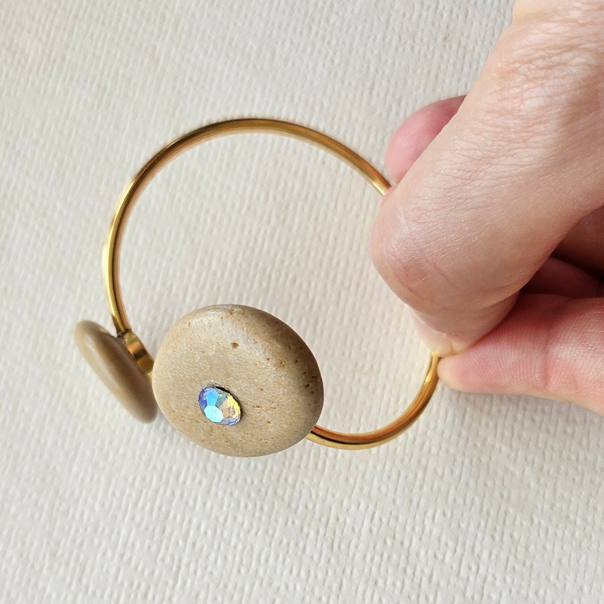 Brazalete abierto en acero dorado, de diseño delicado y armonioso, protagonizado por dos piedras de mar en tono crema, seleccionadas por su suavidad cromática y textura natural. Una de las piedras está embellecida con una circonita de 2 mm incrustada al ras, mientras que la otra luce un cristal de Swarovski de 4 mm que aporta un brillo sofisticado y contemporáneo. Elaborado artesanalmente sin químicos, este diseño exclusivo refleja la elegancia natural y el lujo consciente, pensado para mujeres que buscan piezas únicas con una belleza serena y atemporal.