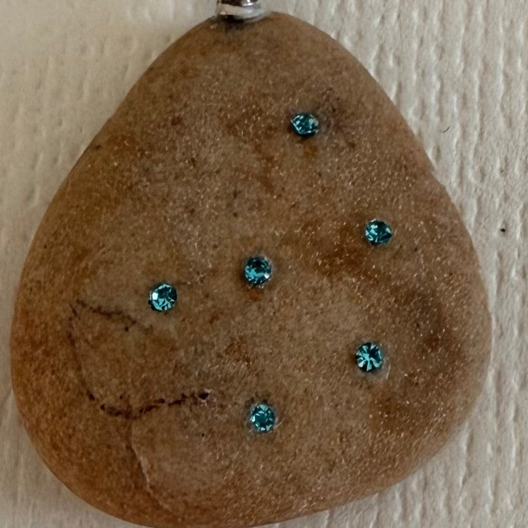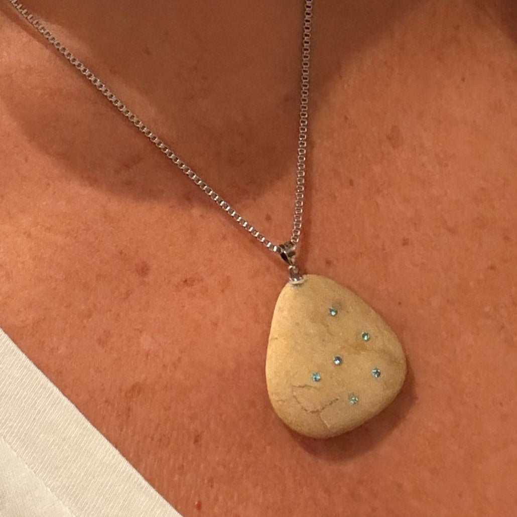 Una joya que captura la calma del Mediterráneo. Esta piedra de mar en tono beige ha sido pulida de forma natural por las olas, y está engarzada con siete cristales Swarovski en azul cielo, que reflejan la luz como el mar en un día claro.