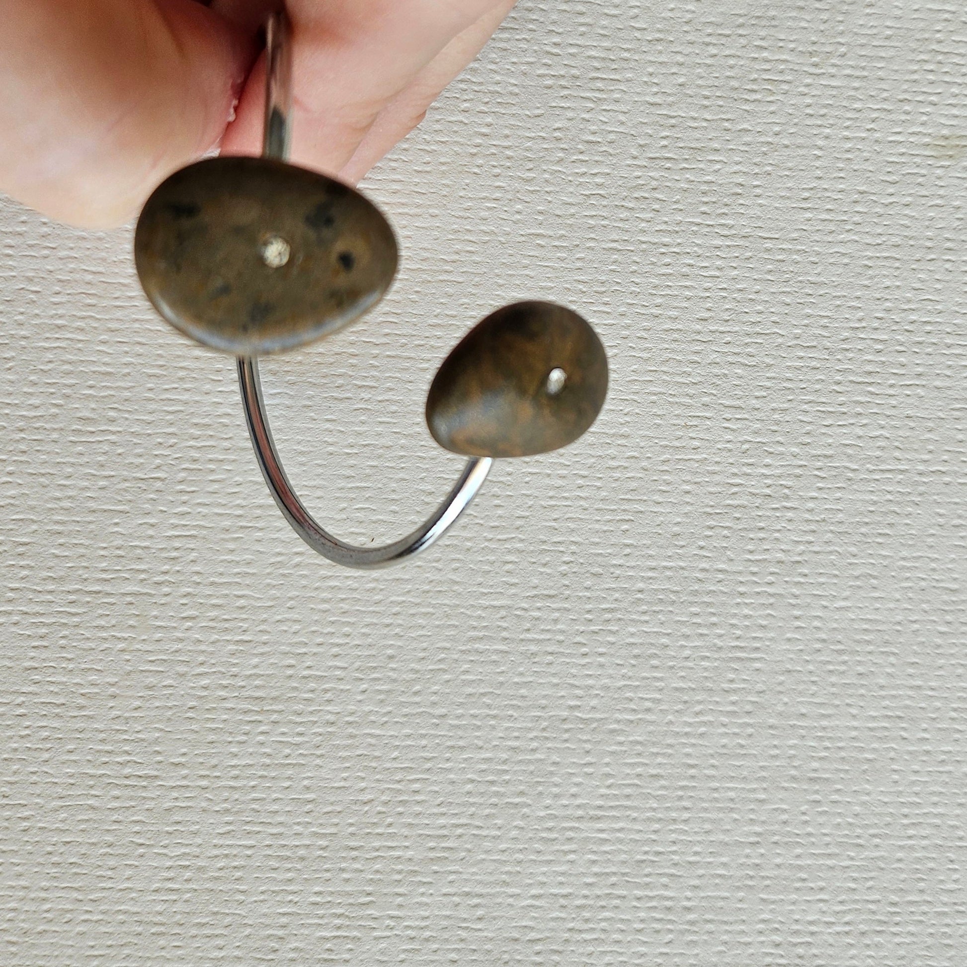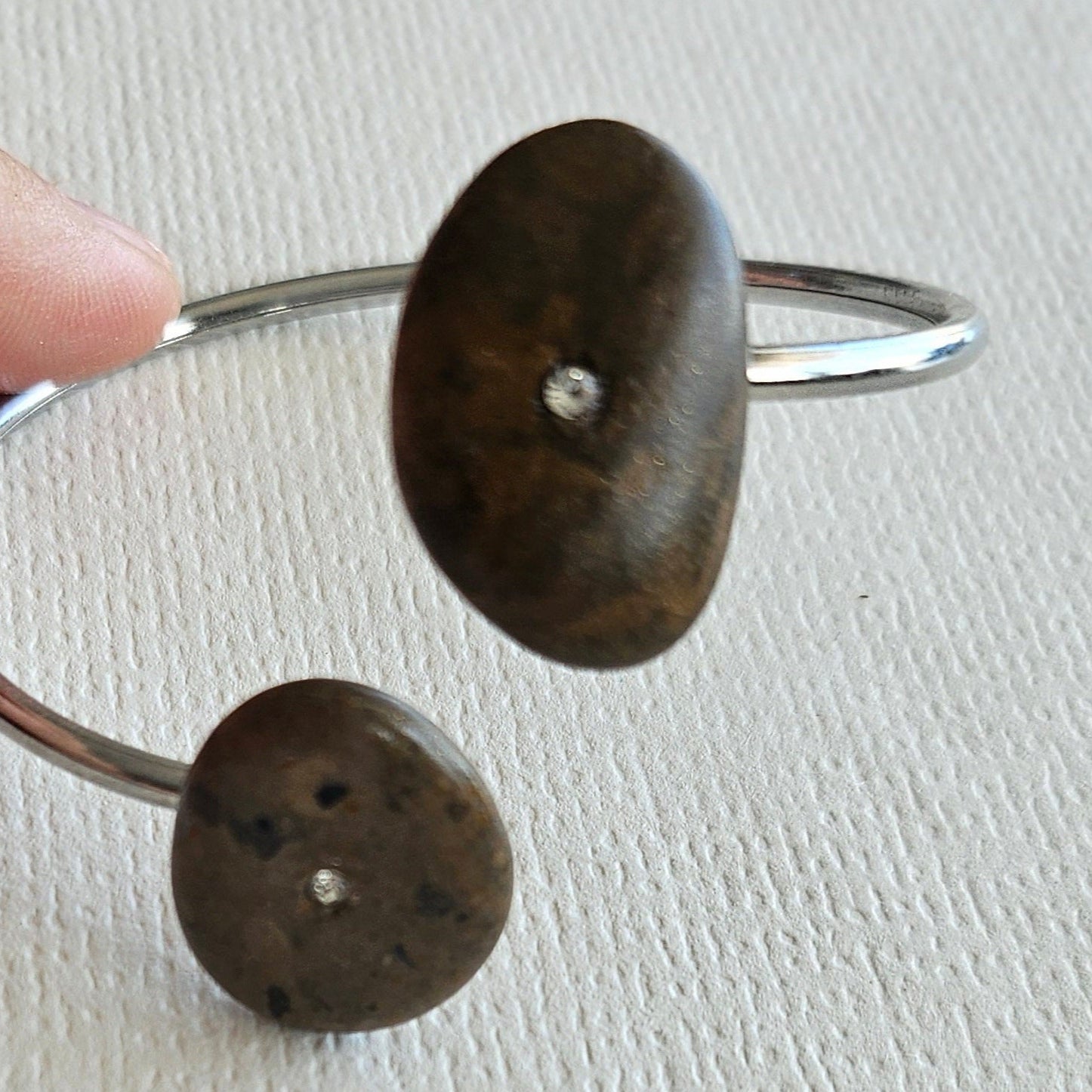 Brazalete abierto y ajustable en acero plateado, elaborado artesanalmente para resaltar la belleza natural de sus dos piedras de mar de formas irregulares. Cada piedra, en tonalidades negras, grises y moteadas, está delicadamente realzada con una circonita de 2 mm incrustada al ras, que aporta un brillo sutil y elegante sin alterar su textura auténtica. Una pieza única, versátil y sofisticada, diseñada para mujeres que valoran el equilibrio entre la fuerza natural y la delicadeza contemporánea.