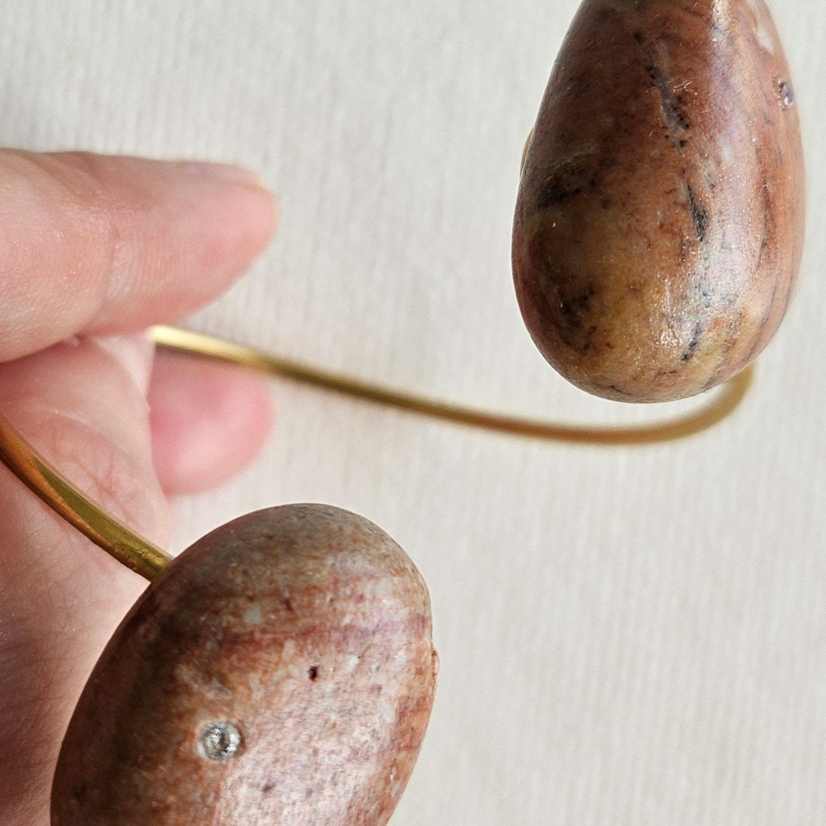 Brazalete abierto en acero dorado, trabajado artesanalmente para realzar dos piedras de mar en tonos rojizos con matices mostaza, óxido y delicadas líneas negras que recorren su superficie de forma orgánica. Una de las piedras está embellecida con una circonita incrustada con la técnica al ras, aportando un destello sutil que contrasta con la riqueza cromática de la pieza. Una joya con fuerza, originalidad y carácter, creada sin químicos y fiel al respeto por la belleza natural. Ideal para mujeres que buscan piezas únicas con alma y estilo propio.