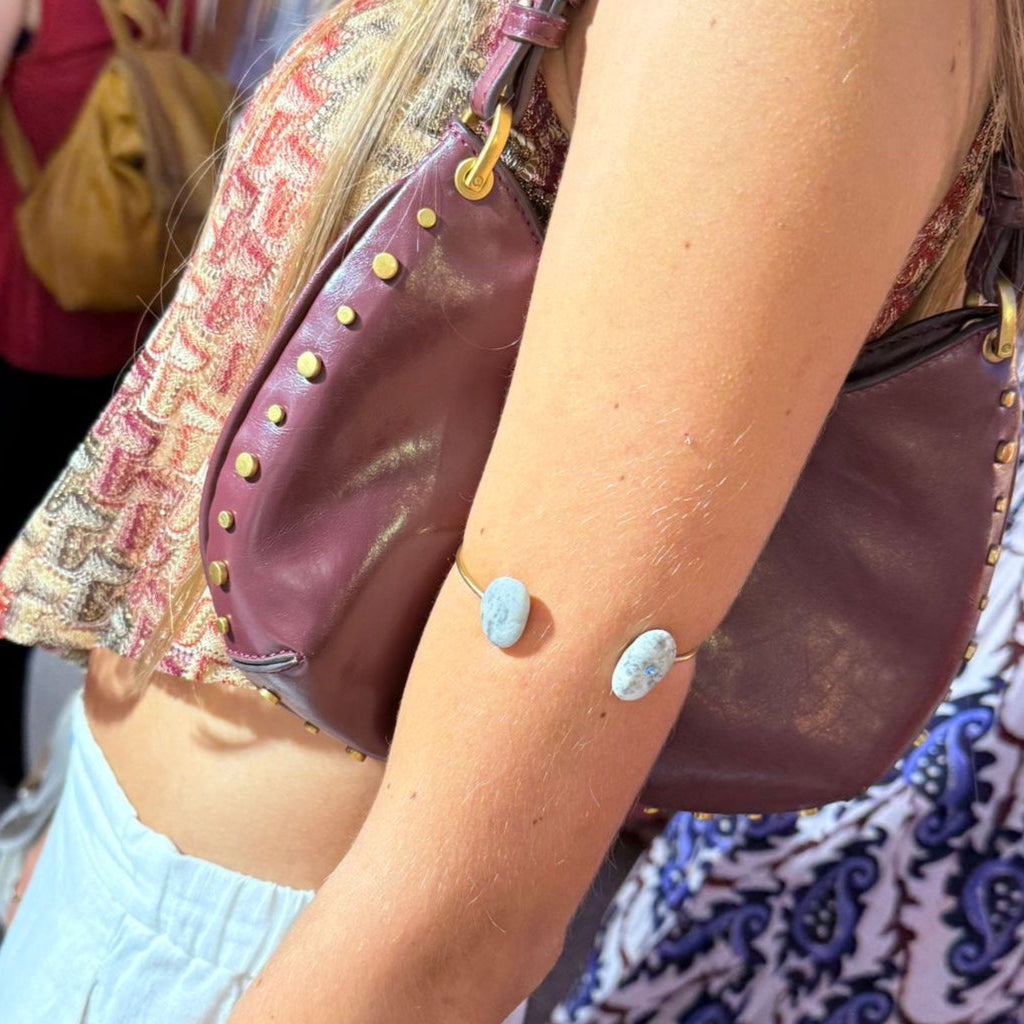 Brazalete abierto de acero inoxidable con baño dorado, de líneas limpias y diseño contemporáneo. En cada extremo, una piedra redonda en tono blanco suave aporta luminosidad y equilibrio. Una de ellas destaca por la incrustación de un cristal Swarovski azul de 2 mm, montado al ras (engaste tipo gitana), que añade un destello refinado y discreto.