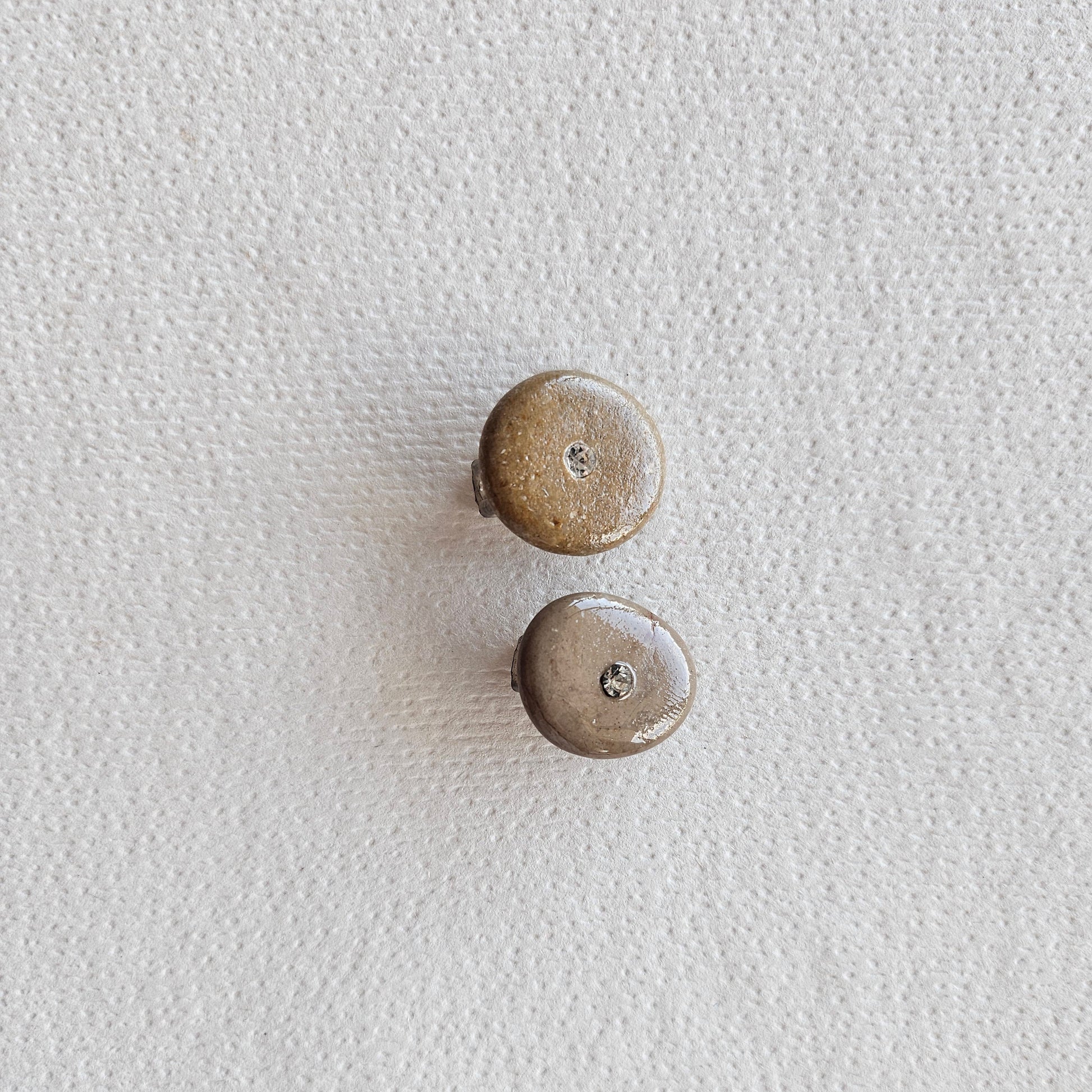 Estos pendientes de clip destacan por su equilibrio y elegancia atemporal. Cada uno presenta dos piedras idénticas en tamaño y color, con una tonalidad arena oscura matizada por sutiles toques grises que evocan la calma de la orilla al atardecer. Una circonita de 2 mm incrustada al ras ilumina la superficie con un brillo preciso, aportando un toque de sofisticación sin romper la serenidad del diseño.