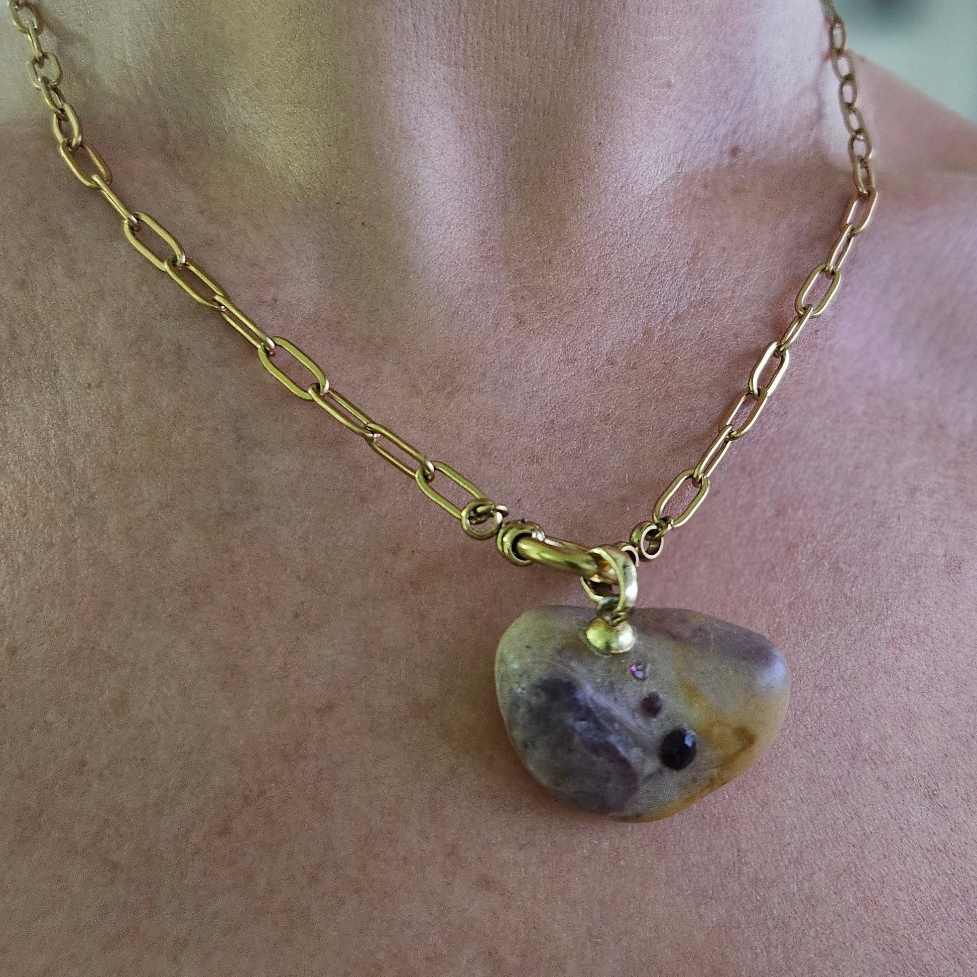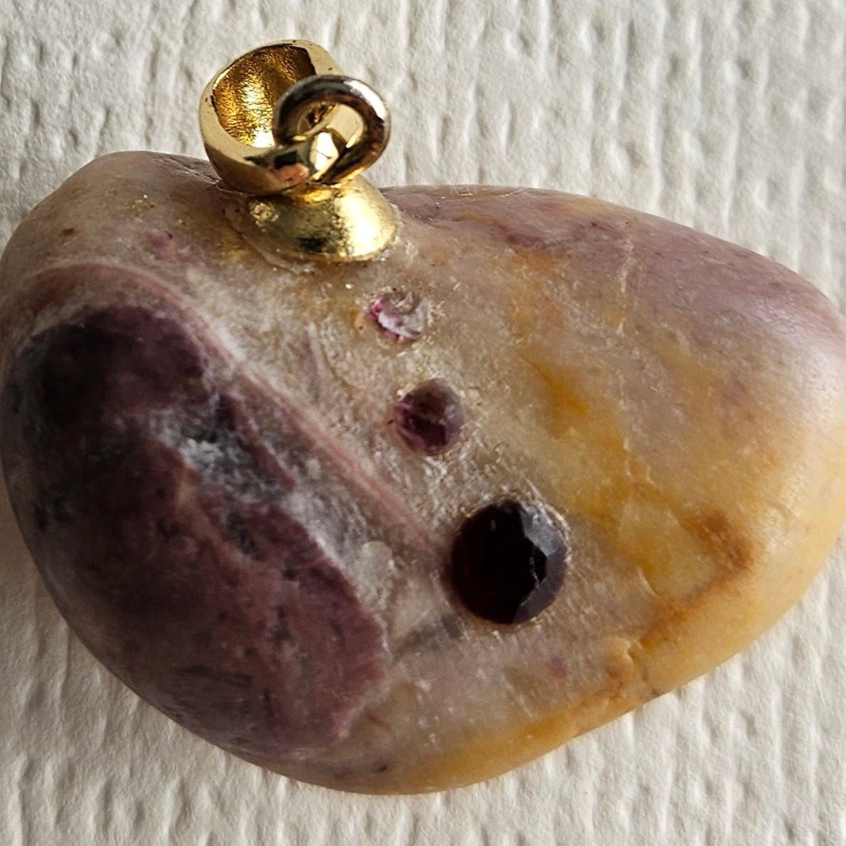 Un fragmento de la naturaleza convertido en joya. Esta piedra de forma irregular despliega un espectacular juego de tonalidades —morado, crema y mostaza— que se funden como pinceladas sobre un lienzo mineral irrepetible.