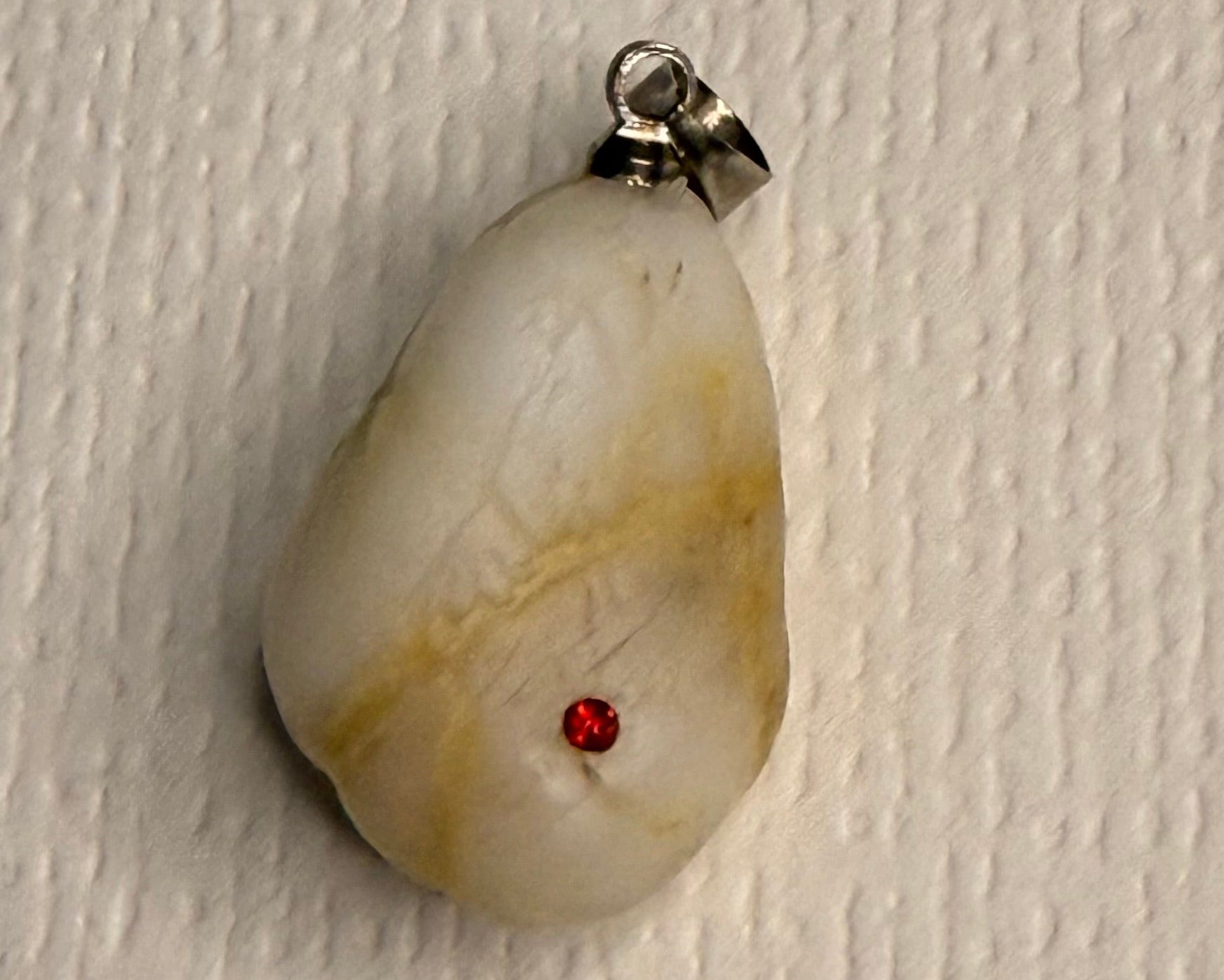 Magnífico colgante de piedra de mar blanca con una delicada franja en tono bronce y una brillante incrustación de cristal rojo. Su enganche en plata 925 completa esta creación única: una auténtica maravilla de la naturaleza transformada en joya por Little Piece of Sea.