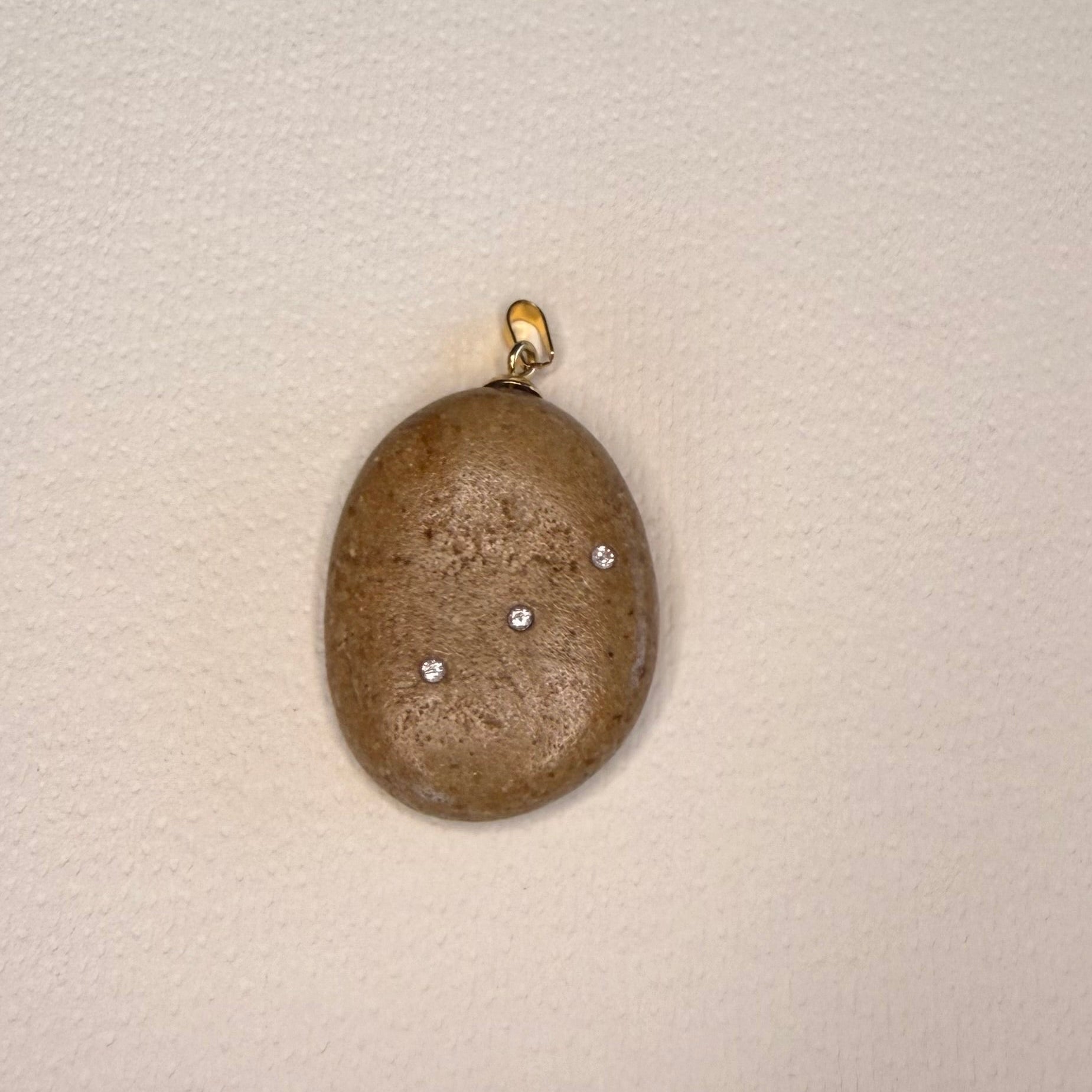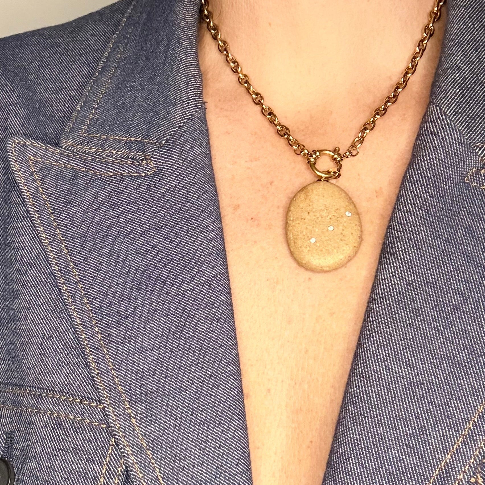Una joya delicada y auténtica, una piedra donde la simplicidad del moldeado por el mar se une al brillo del dorado. Perfecta para quienes valoran la belleza natural y los pequeños destellos de luz de 3 circonitas blancas que hacen especial esta joya.