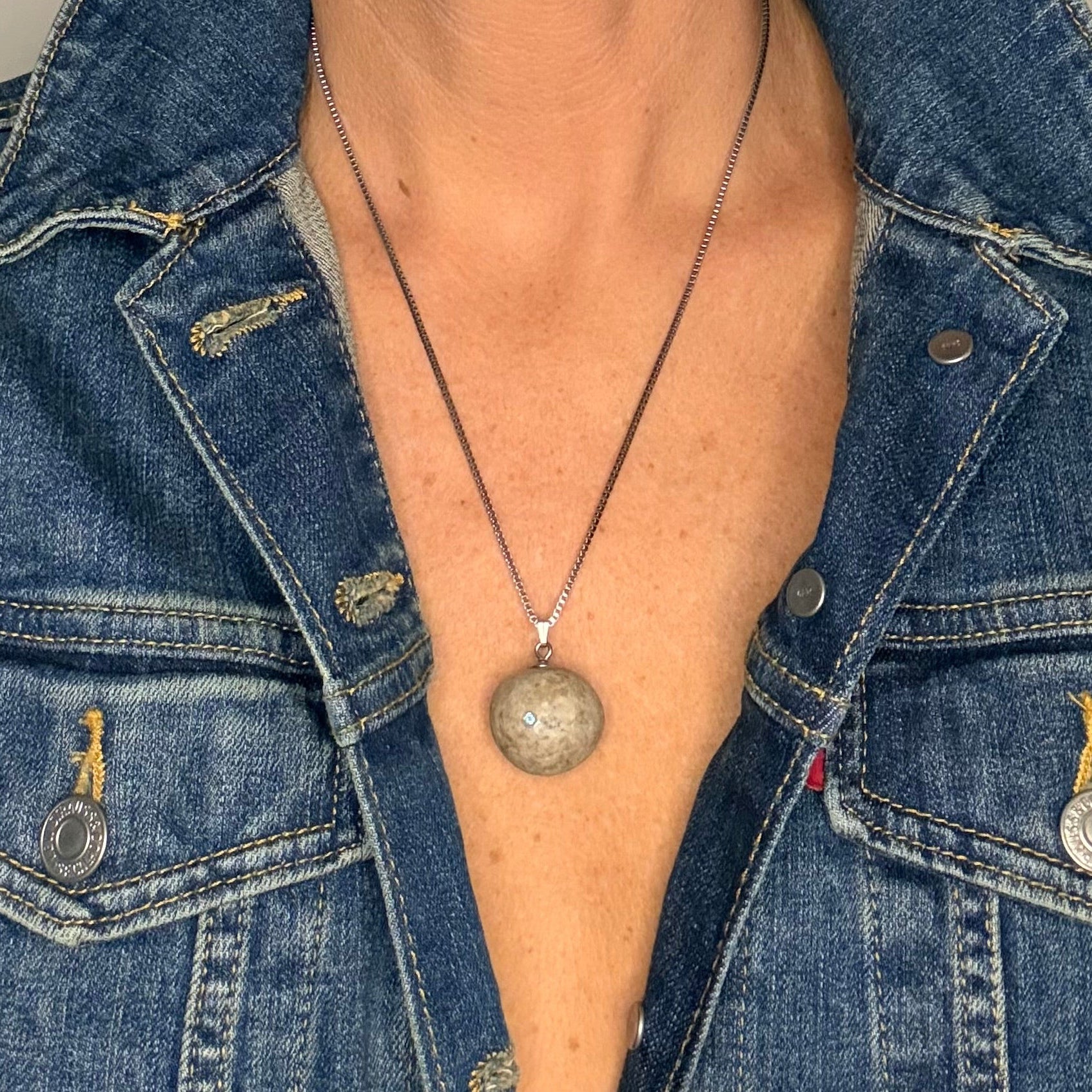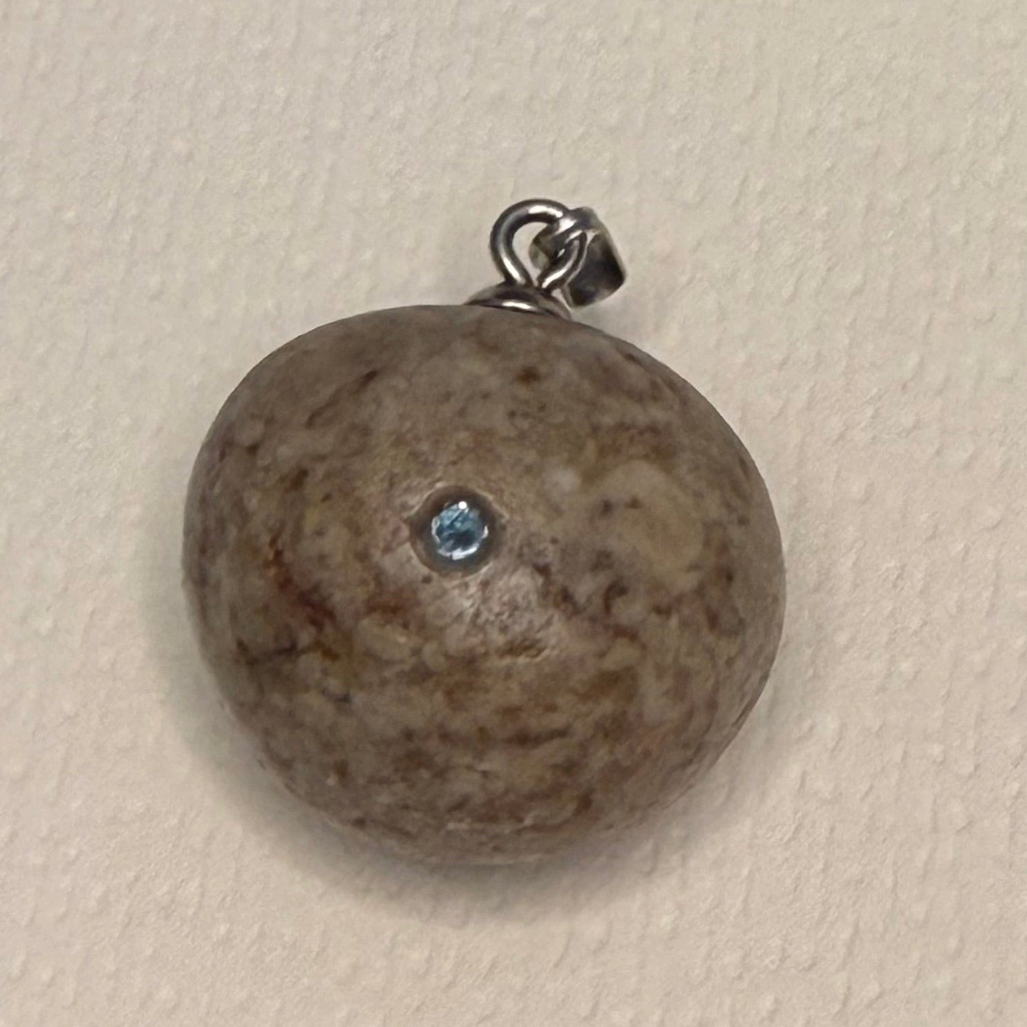 Precioso colgante de piedra de mar redondeada, en suave tono gris claro, con una delicada incrustación de cristal azul cielo que evoca la serenidad del mar. Su enganche en acero inoxidable completa esta joya diferente, un auténtico capricho de la naturaleza pulido por las olas.