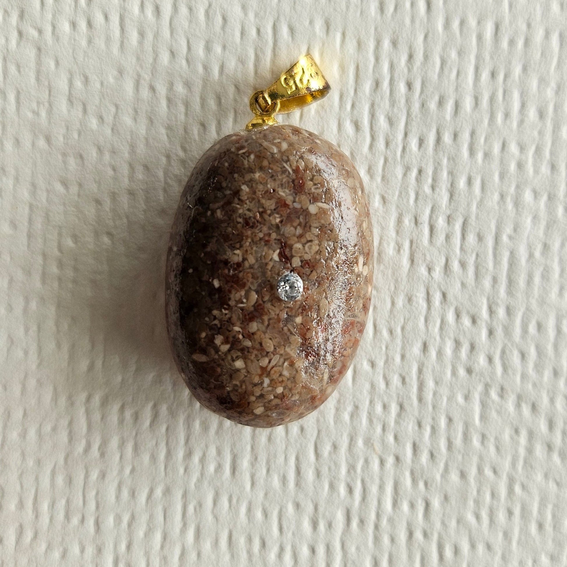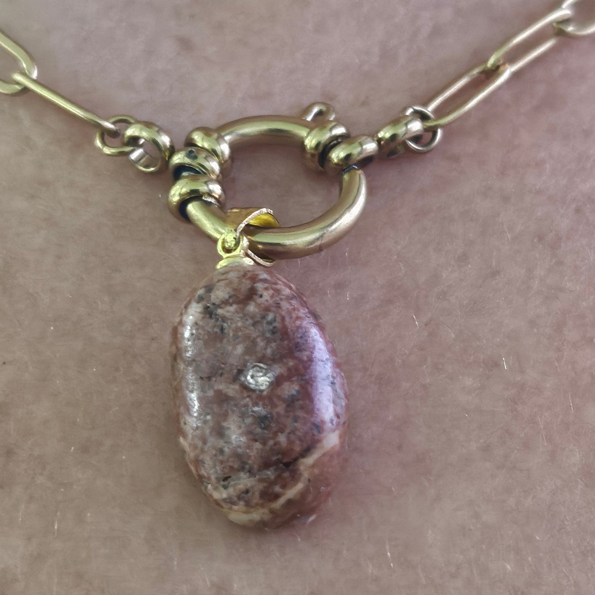 Este colgante presenta una piedra de mar cuidadosamente seleccionada, de forma ovalada y con un jaspeado natural en tonos tierra que evoca paisajes orgánicos e irrepetibles.