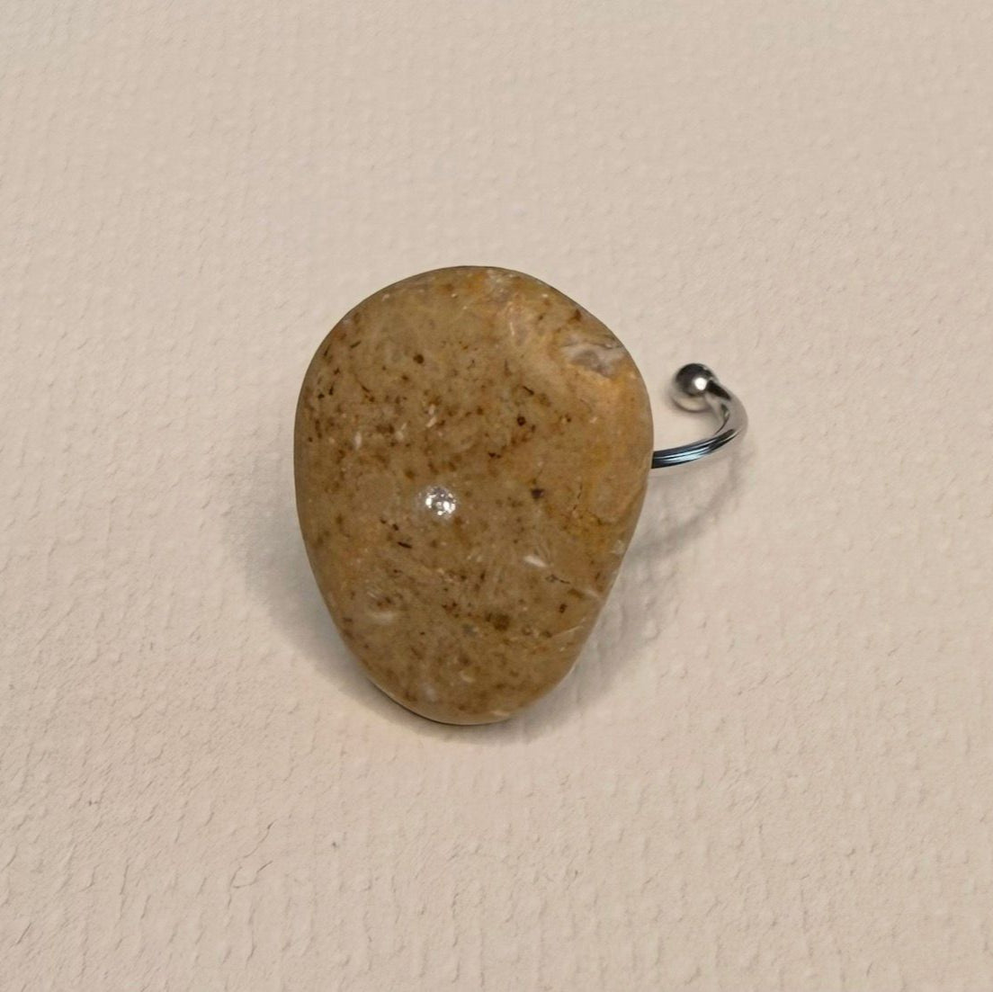 Este anillo destaca por su equilibrio entre naturalidad y elegancia. Su base ajustable en acero plateado ofrece comodidad y adaptabilidad, mientras que la piedra ovalada de forma irregular, en una suave tonalidad color arena, evoca calma y sutileza. En el centro, una circonita incrustada al ras de 2 mm aporta un destello delicado que ilumina la piedra con discreción. La combinación de texturas y tonos neutros crea una joya refinada y versátil, perfecta para quienes valoran la belleza en los detalles sencillos y auténticos.