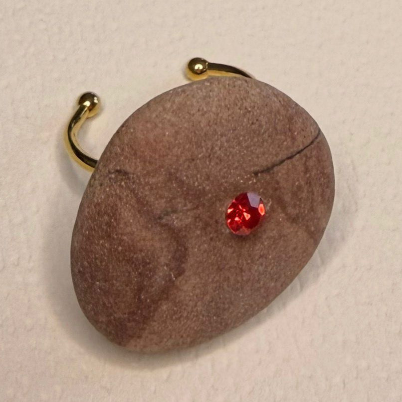 Este anillo combina la fuerza del diseño contemporáneo con la belleza natural de la piedra. Su base ajustable en acero dorado aporta comodidad y brillo cálido, mientras que la piedra, en tonalidades rojizas, dibuja formas orgánicas que evocan el movimiento de una duna al sol. Un cristal Swarovski rojo de 3 mm incrustado al ras intensifica la pieza con un destello vibrante y sofisticado. La unión de texturas y colores crea un equilibrio armónico, pensado para resaltar la personalidad y el estilo de quien lo lleva.