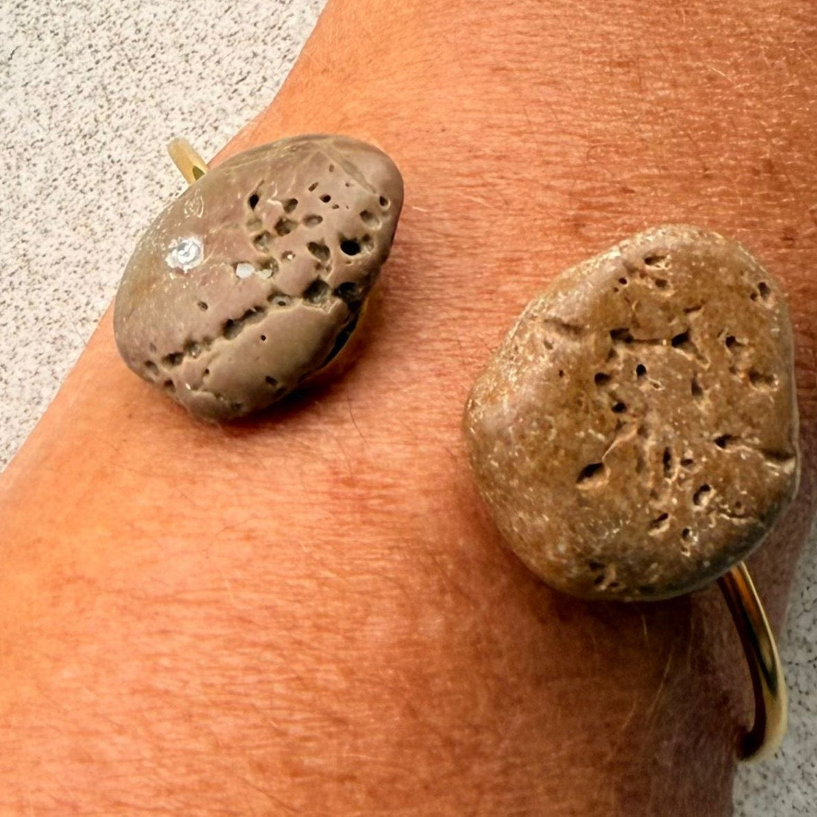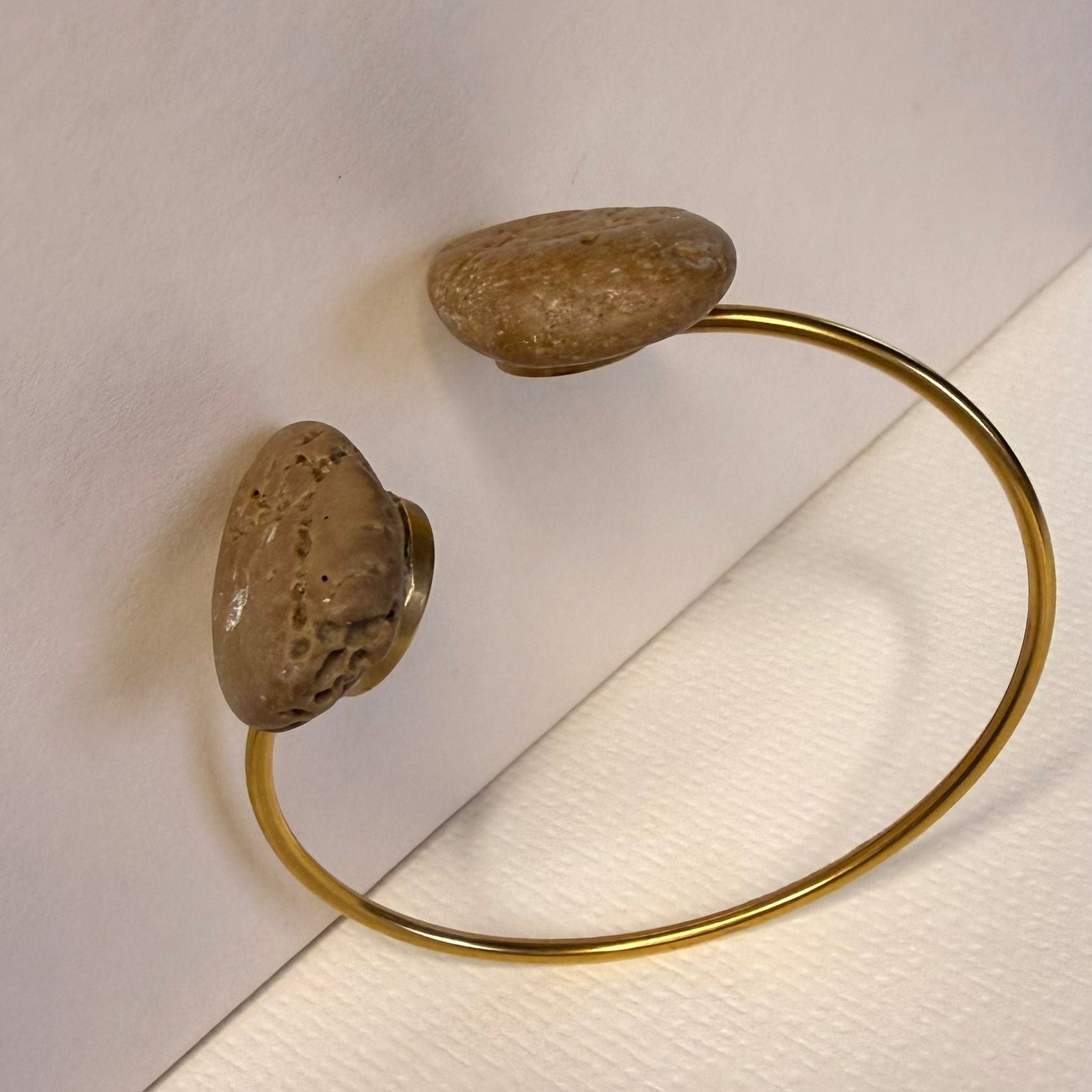 Brazalete rígido de acero inoxidable plateado, elaborado a mano pieza por pieza, con atención a cada detalle. Está adornado con dos piedras de mar naturales con agujeros, conocidas como piedras bruja, valoradas por su energía protectora y su carácter único. Una de ellas lleva una delicada circonita de 2 mm engarzada al ras (montura gitana), que aporta un toque sutil de brillo sin alterar su esencia natural.