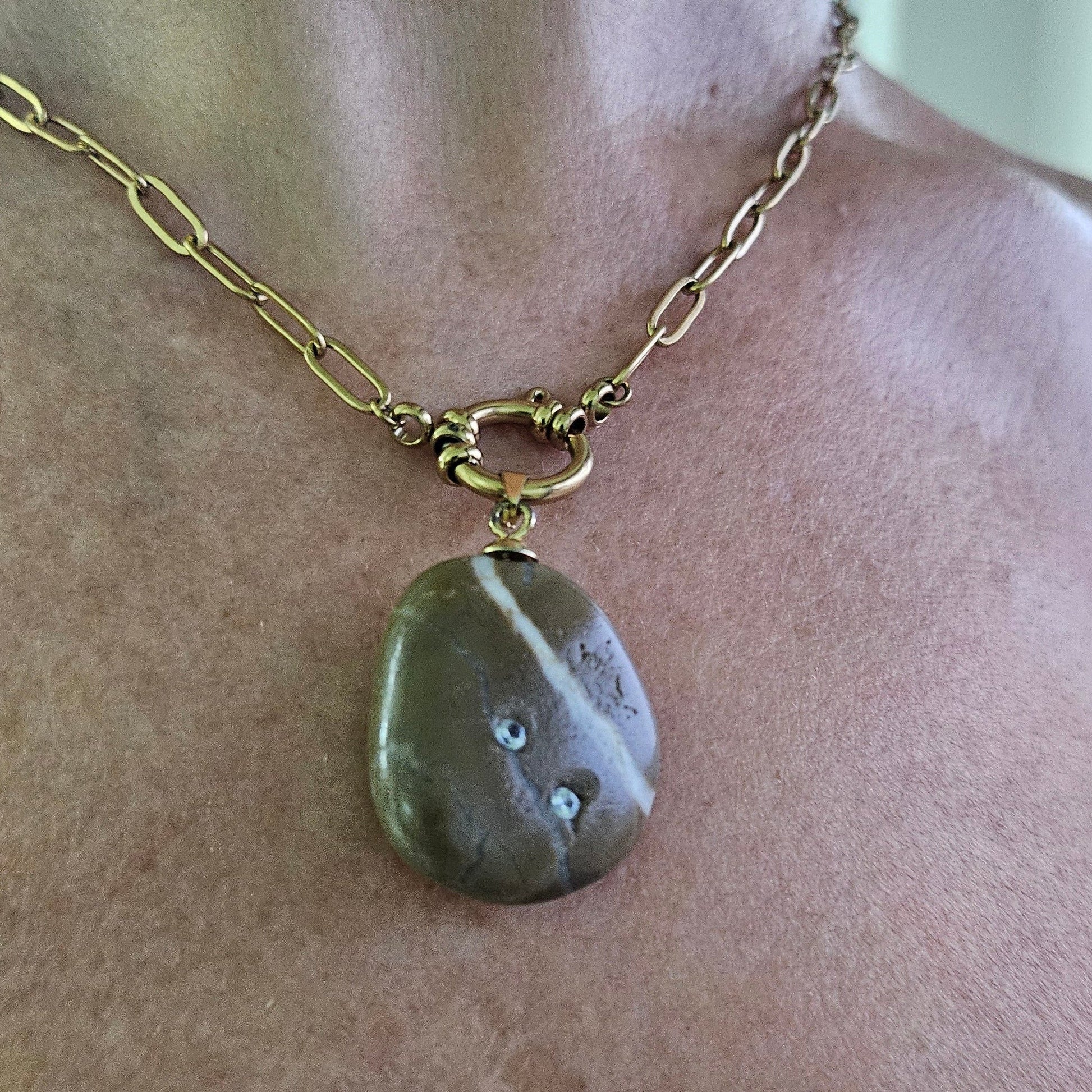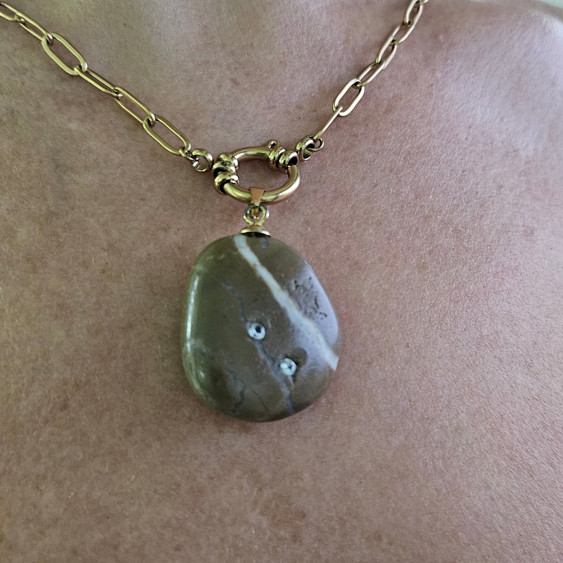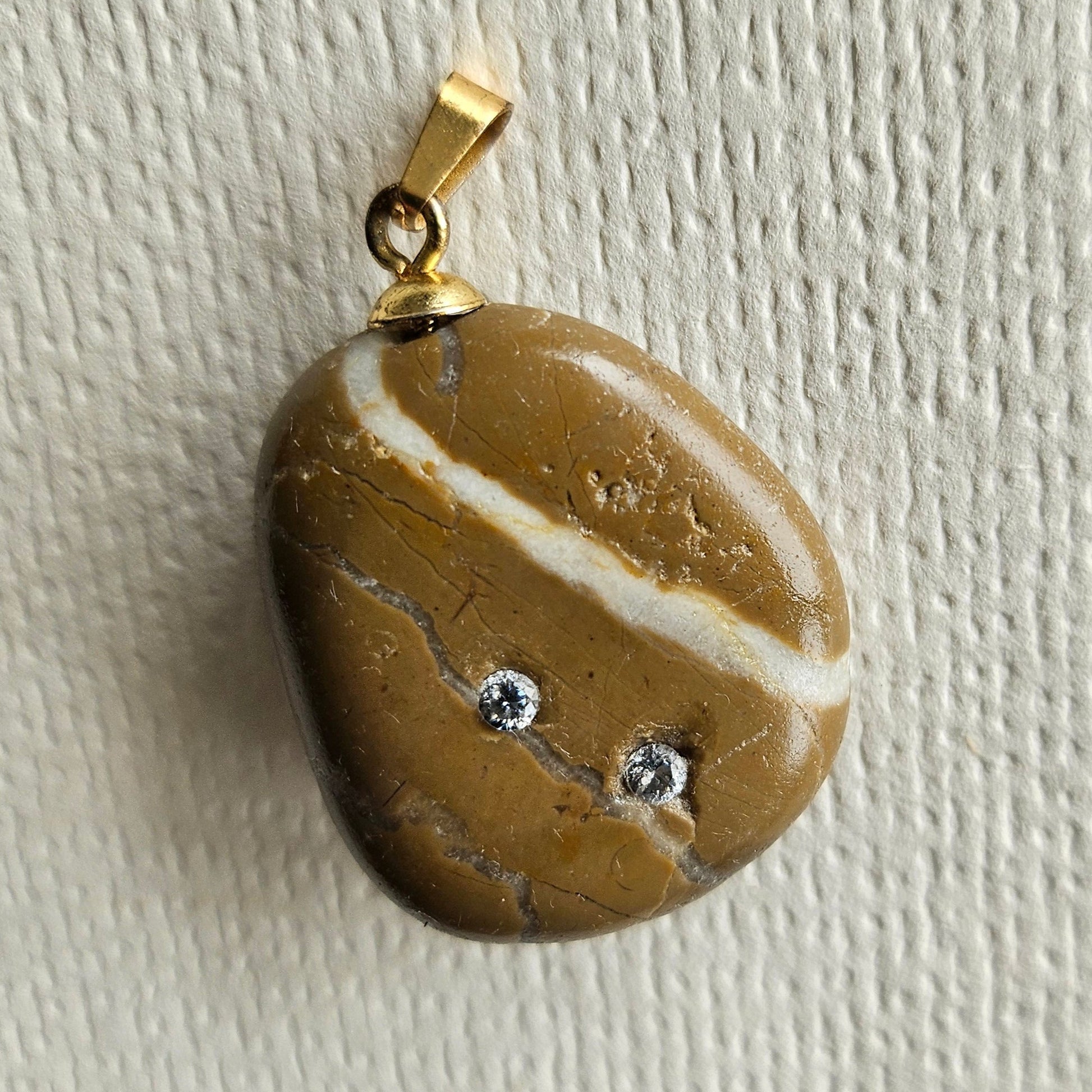 La piedra ovalada de forma irregular, en tonalidad arena, se ve atravesada por una delicada línea transversal que aporta equilibrio y carácter. En uno de sus lados, circonitas incrustadas al ras de 2 mm iluminan con destellos sutiles, creando un contraste refinado con la suavidad de la piedra. El enganche en acero dorado añade un toque de calidez y distinción, realzando la nobleza del conjunto. El resultado es una joya exclusiva que convierte la sencillez en sofisticación.