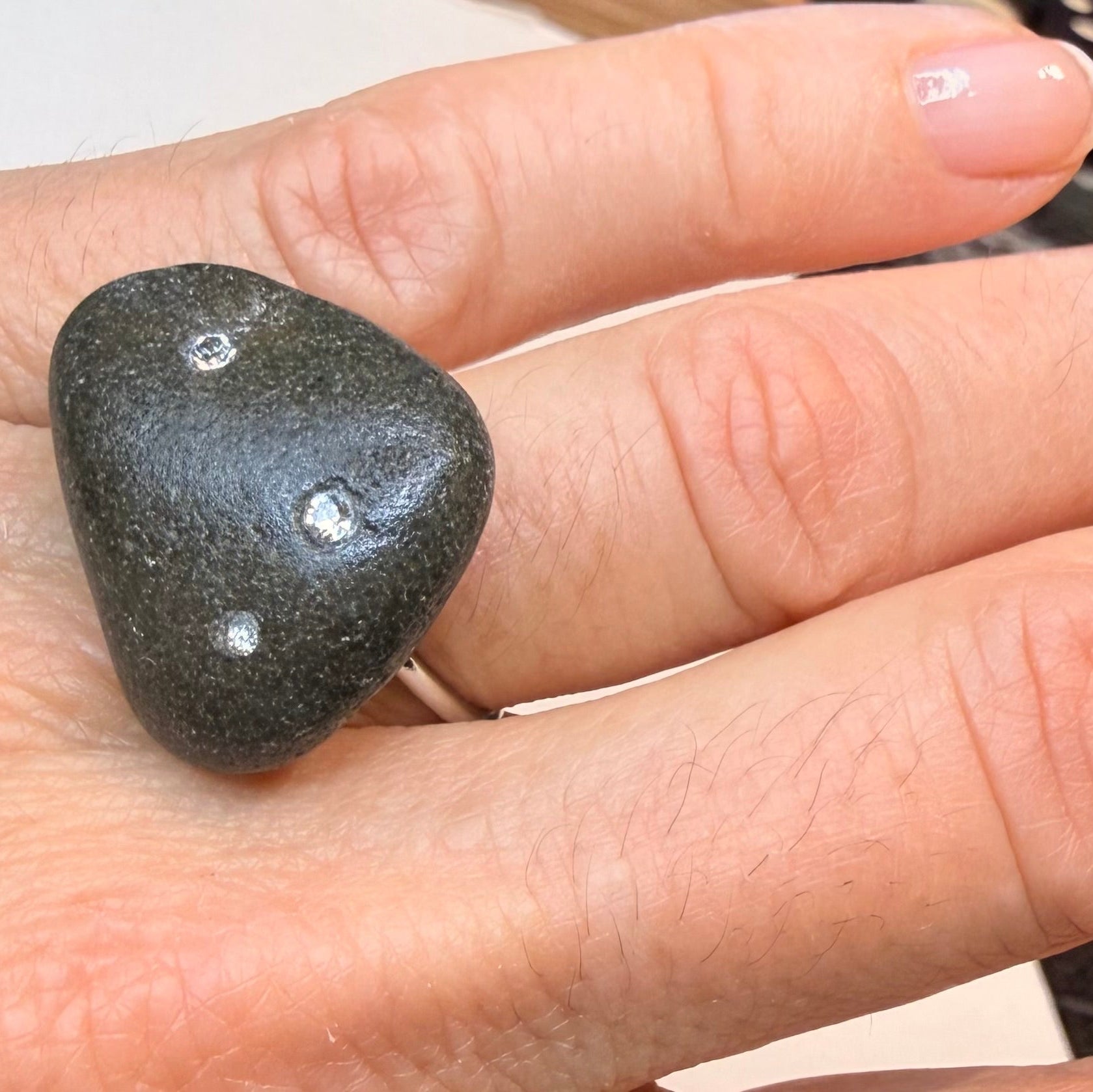 Anillo con piedra de mar en tono negro profundo, de forma triangular y textura rugosa, conservando la huella del océano en cada arista.