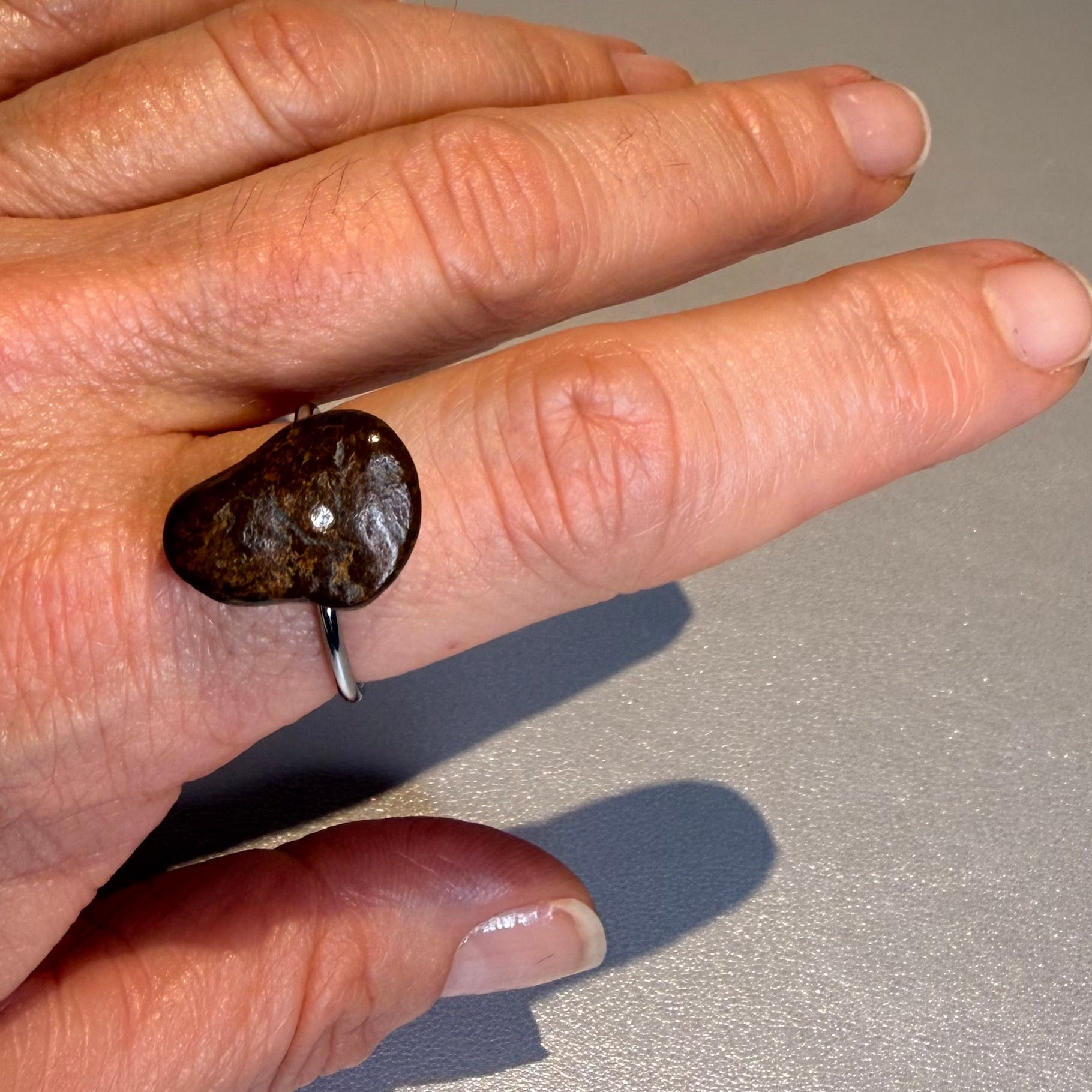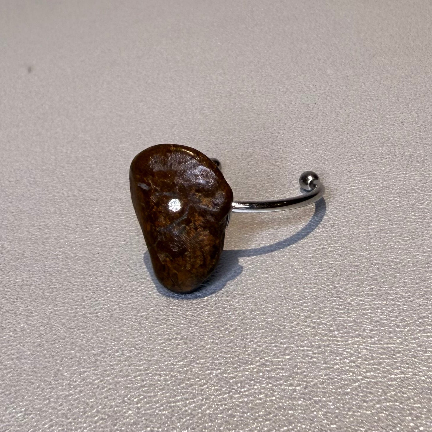 Maravilloso anillo en tonos marrones con un precioso relieve rugoso que aporta textura y carácter. La piedra presenta dos tonalidades de marrón que se combinan de forma única, realzadas por la incrustación de dos circonitas brillantes. Montado sobre una base de acero inoxidable ajustable, ideal para adaptarse cómodamente a cualquier dedo.