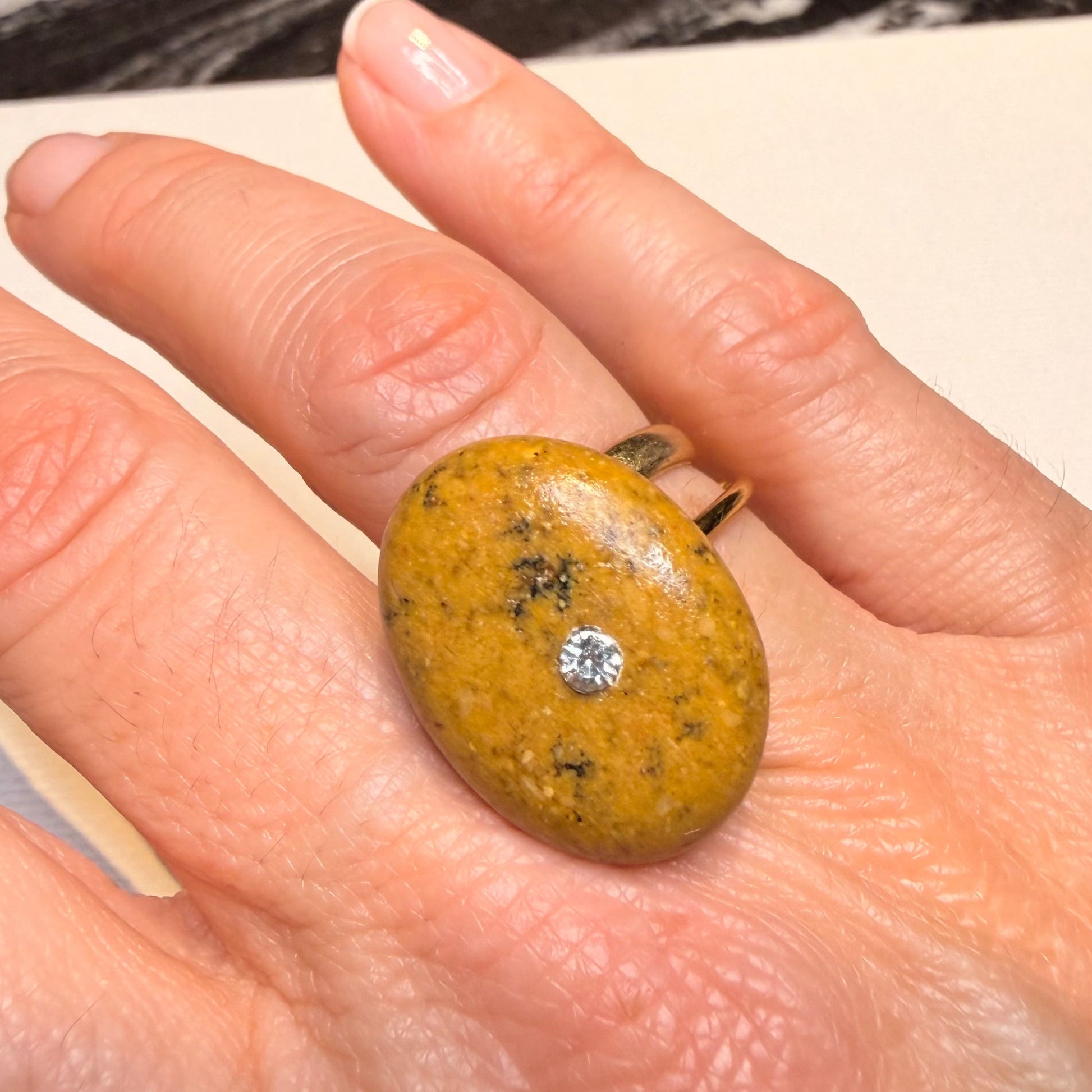 Diferente y espectacular piedra de mar en tonalidades anaranjadas con delicados detalles en negro, realzada con una circonita central. Montada sobre base dorada de acero inoxidable ajustable. Una pieza única, con carácter y alma de mar.
