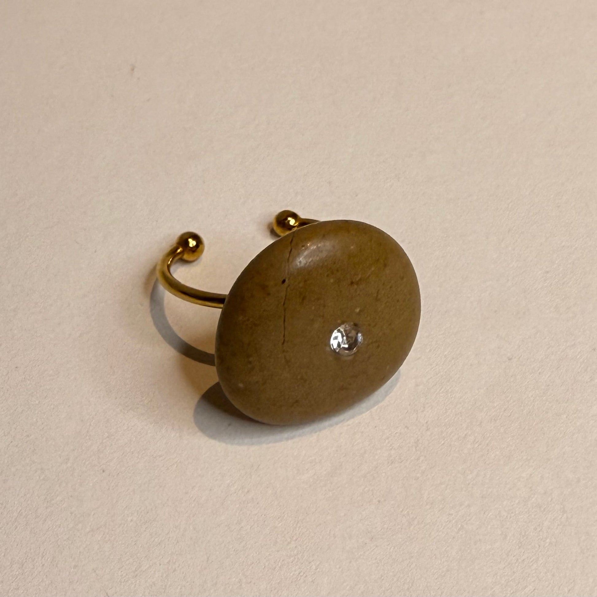 Anillo de piedra de mar pulida y achatada por el vaivén de las olas, en un delicado tono marrón. Luce una circonita central incrustada que aporta un brillo sutil. Montada sobre base de acero inoxidable dorado ajustable.