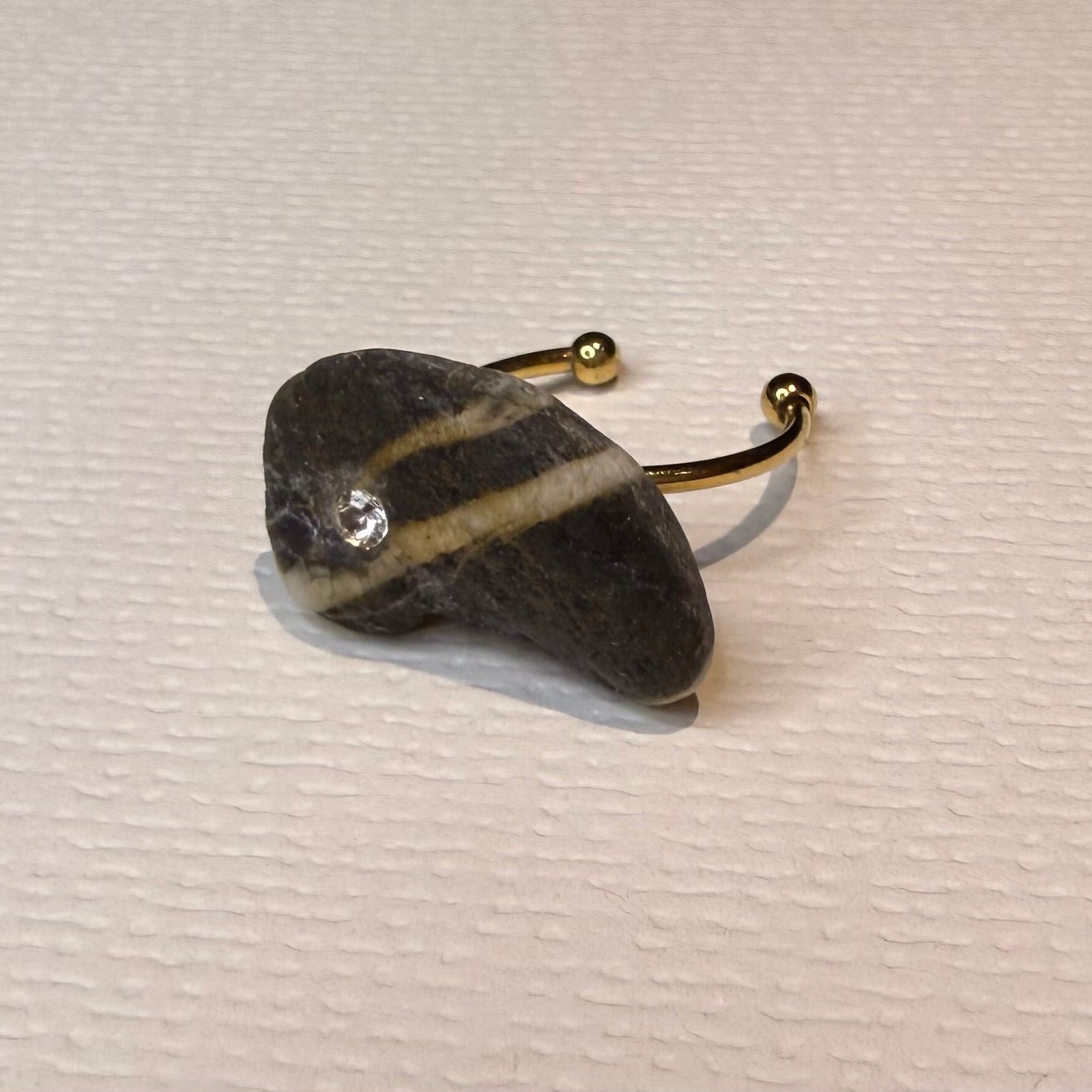Con una circonita que brilla suavemente sobre una base dorada de acero inoxidable ajustable, es una joya natural, imperfecta y perfecta a la vez.