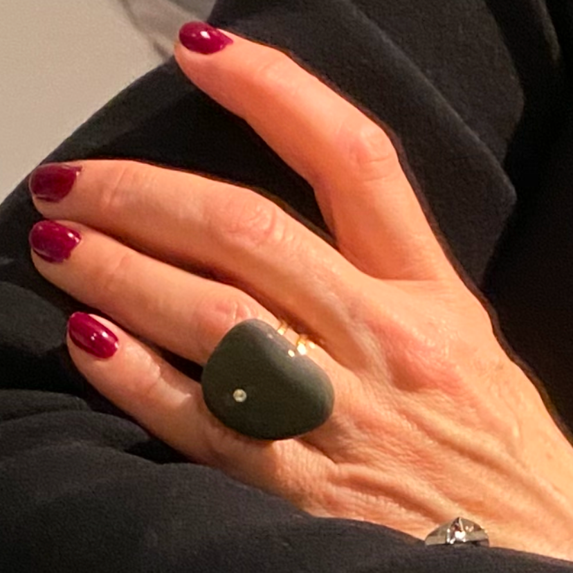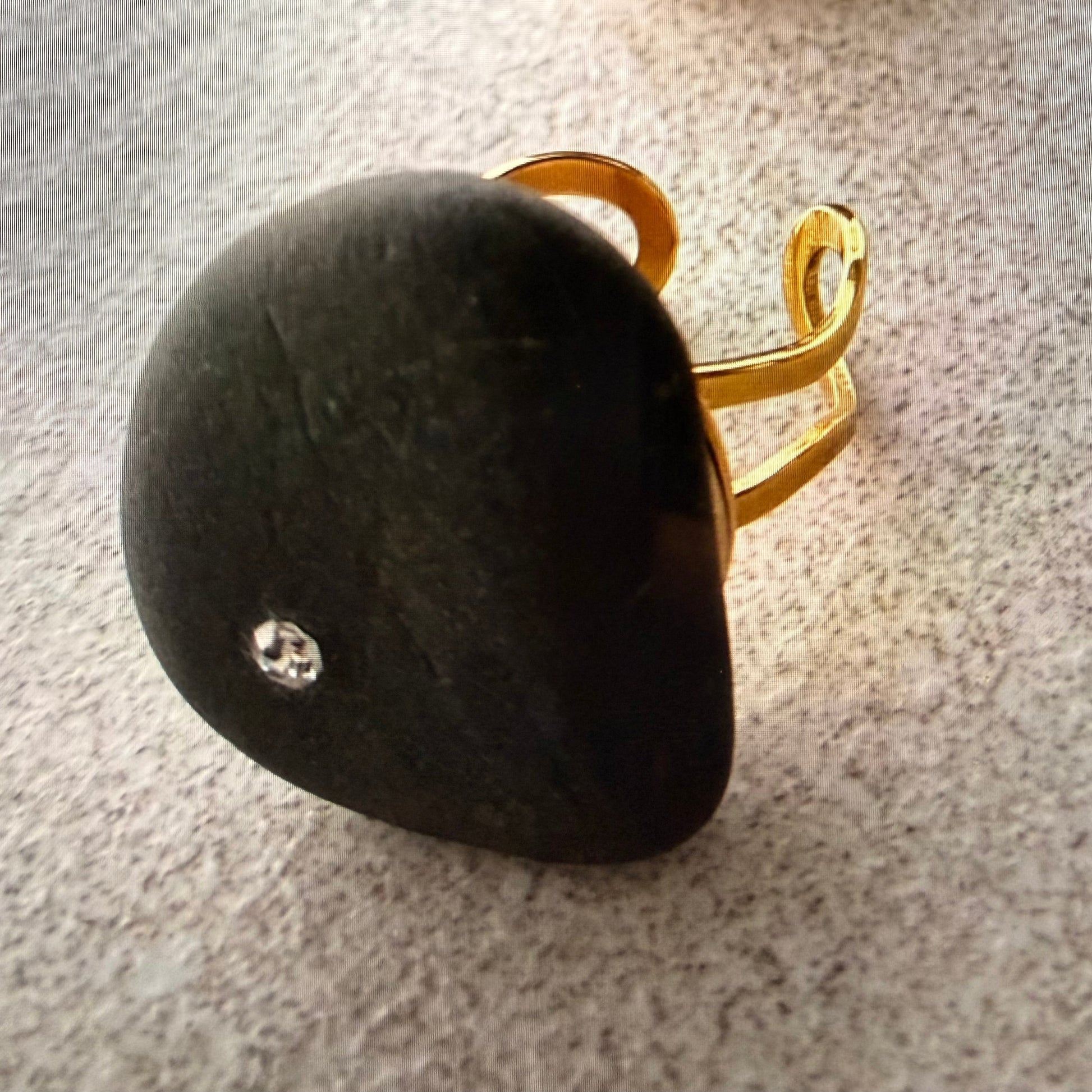 Maravilloso anillo con piedra de mar moldeada de forma curvilínea en color negro mate y tacto rugoso, realzada con una circonita incrustada. Montado sobre una base doble de diseño exclusivo en acero inoxidable dorado ajustable. Una pieza con carácter y presencia.