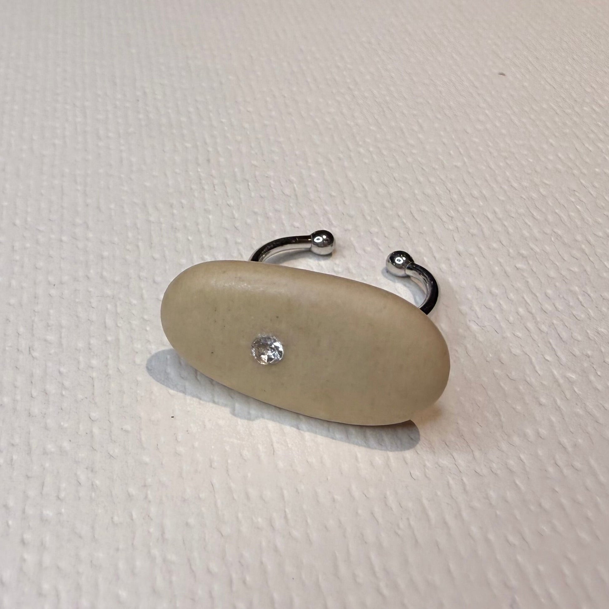 Anillo con piedra de mar en tono beige suave, con forma de haba y un brillo sutil que recuerda a la luz de la luna sobre el agua.